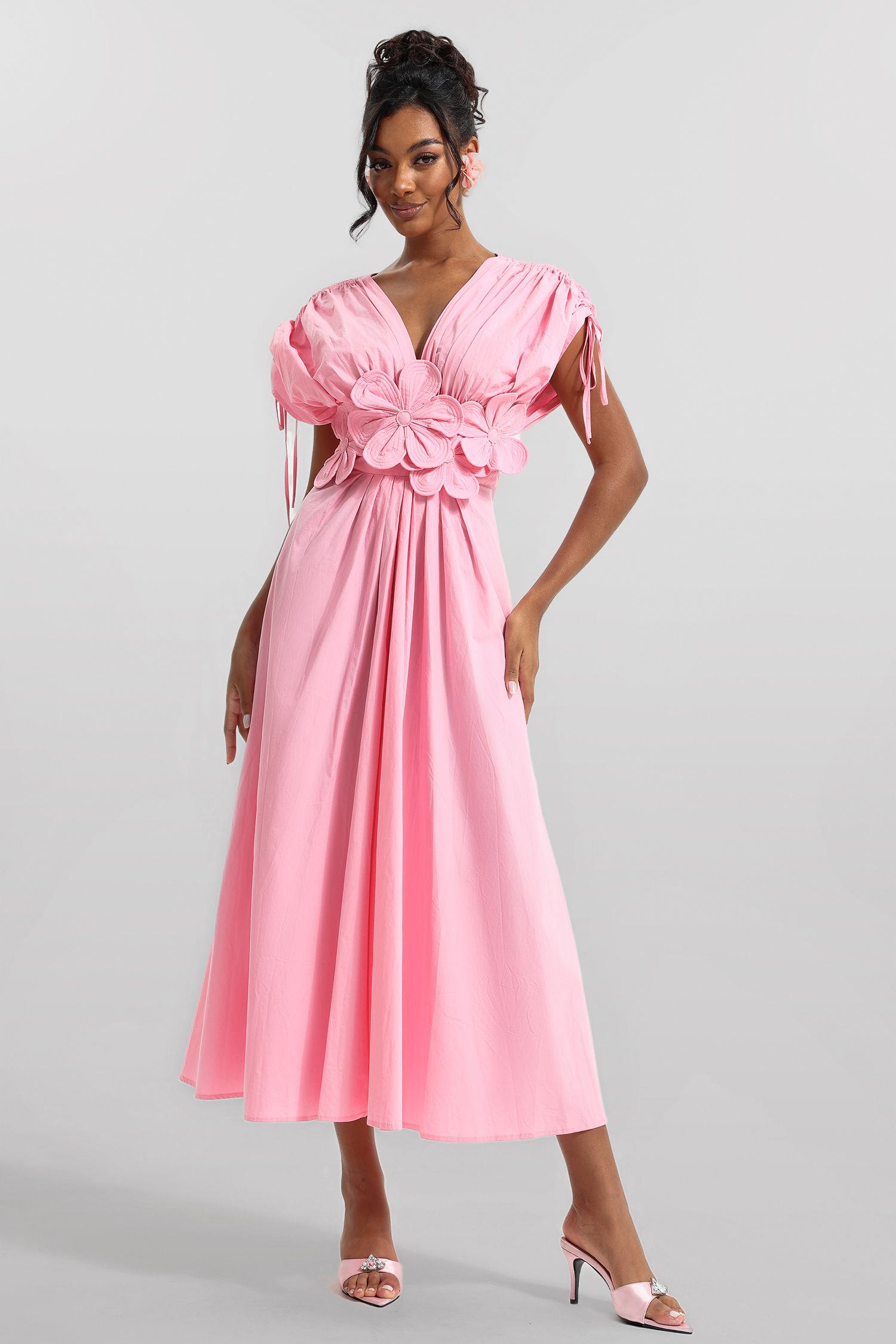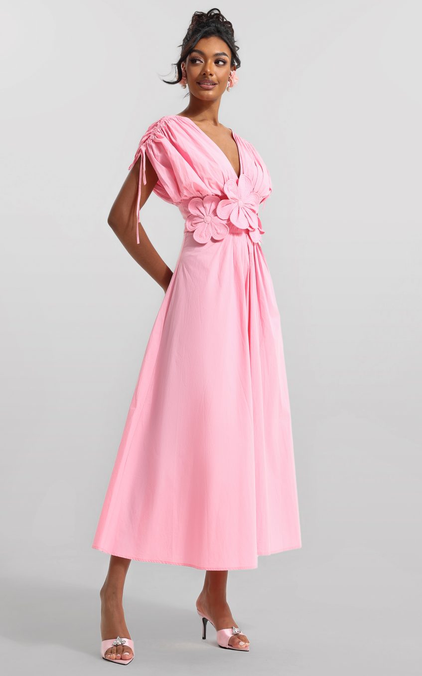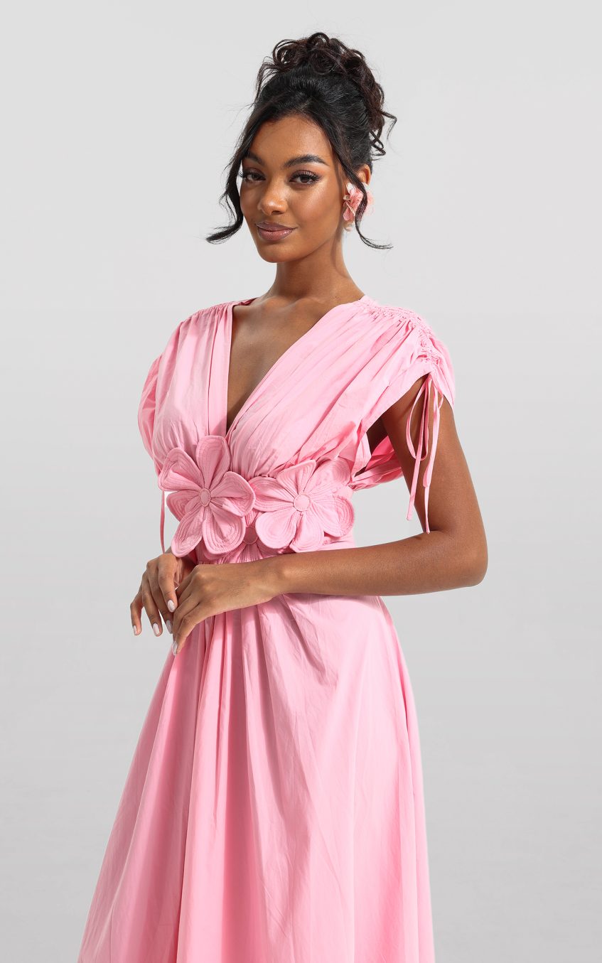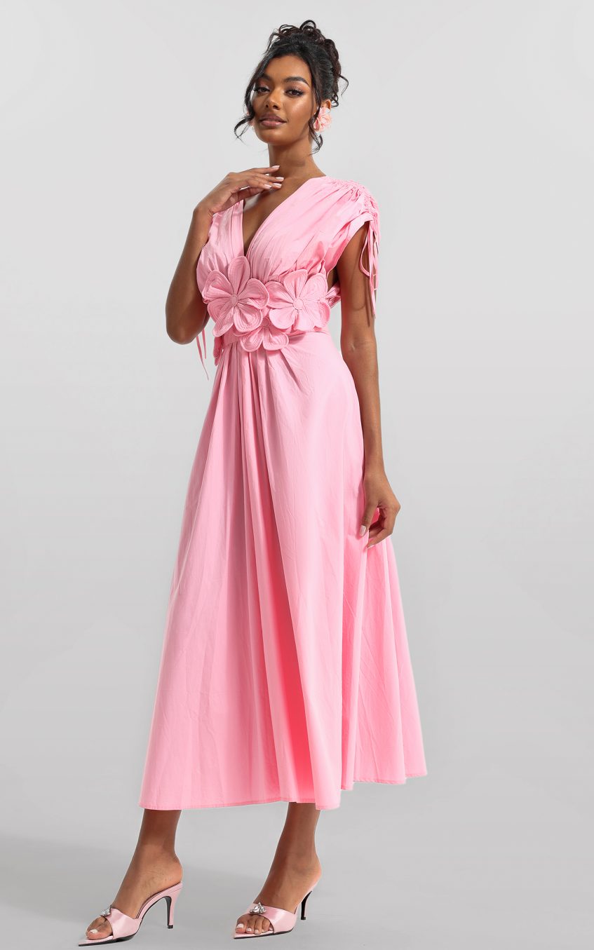 3D Floral V-Neck Lace Up Midi Dress