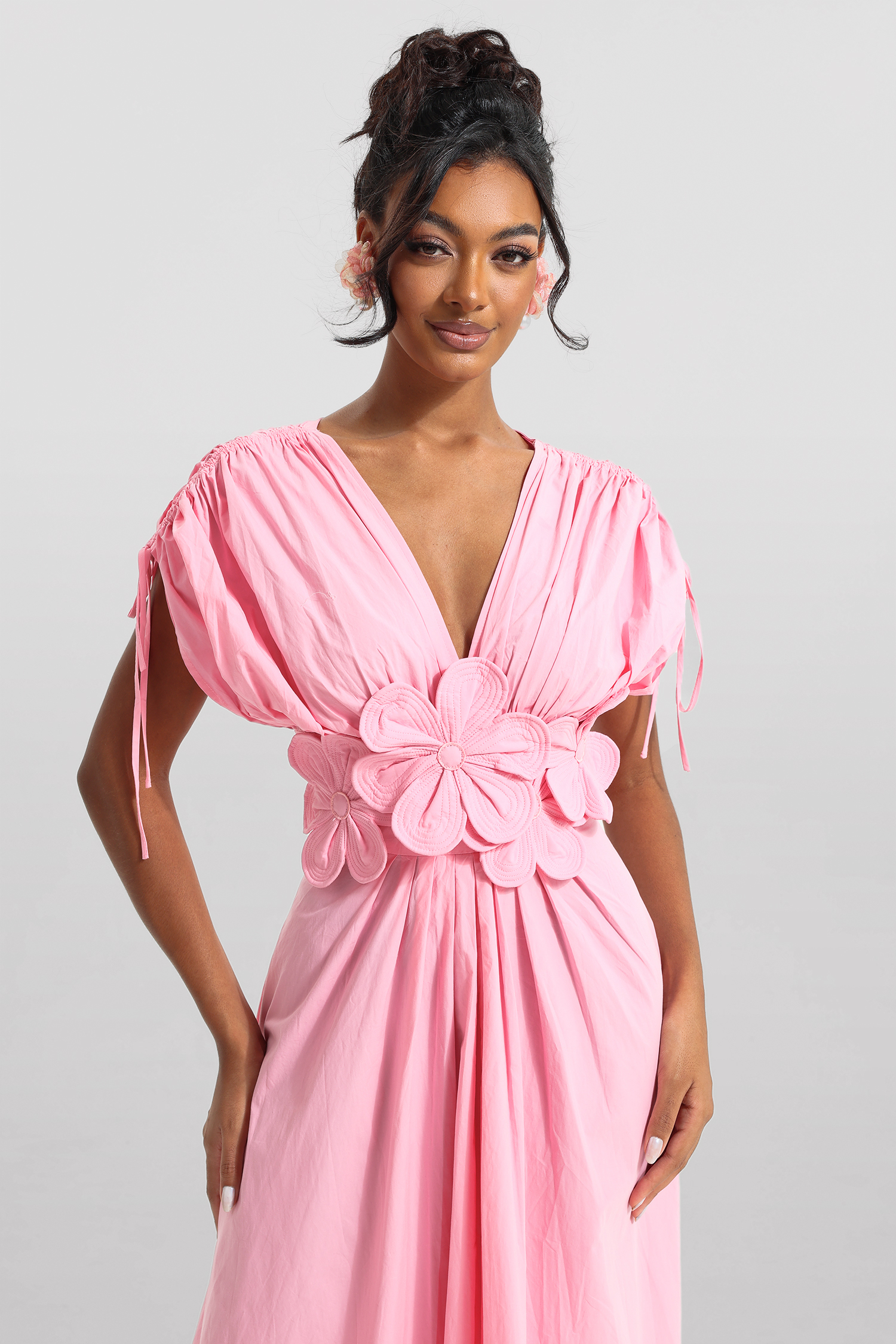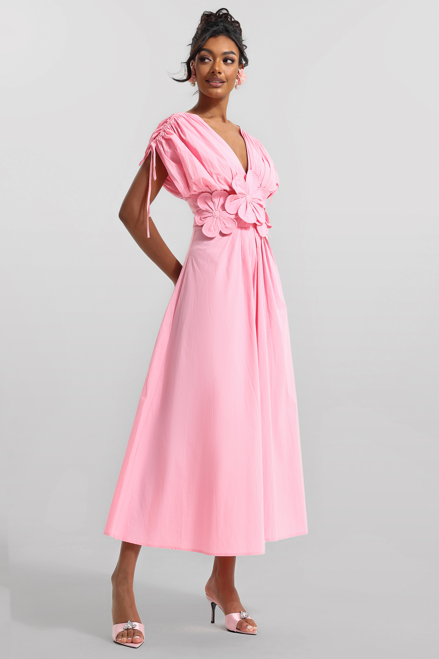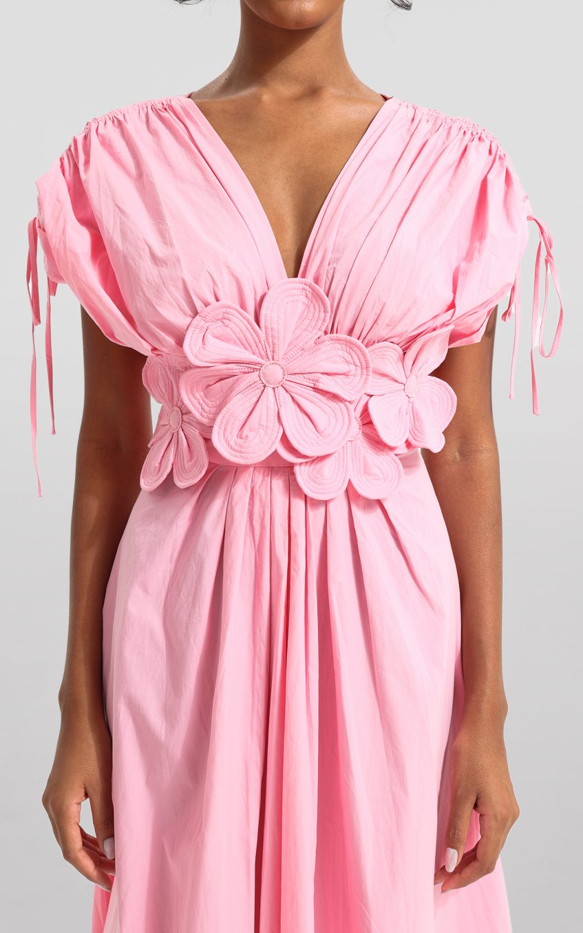 3D Floral V-Neck Lace Up Midi Dress