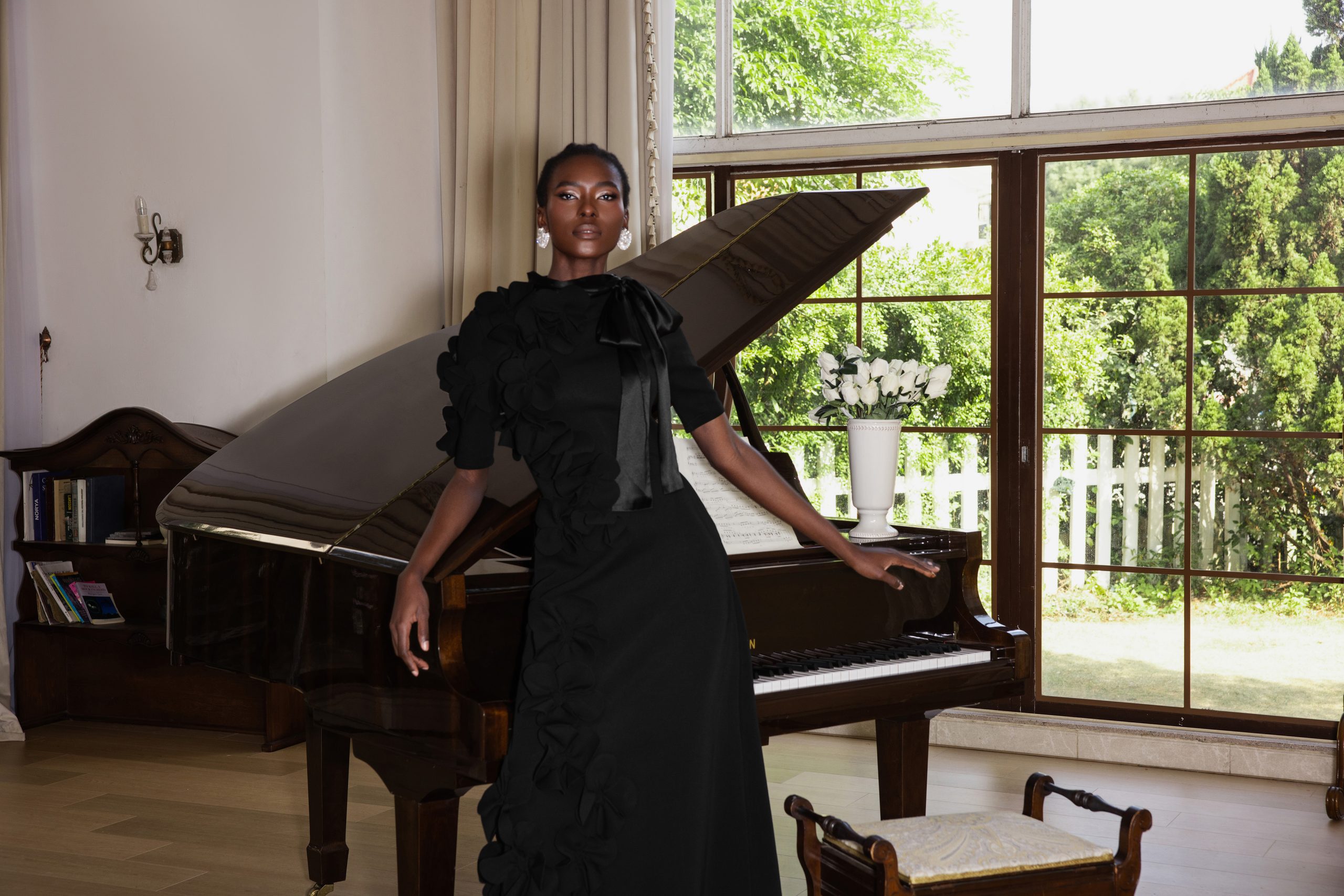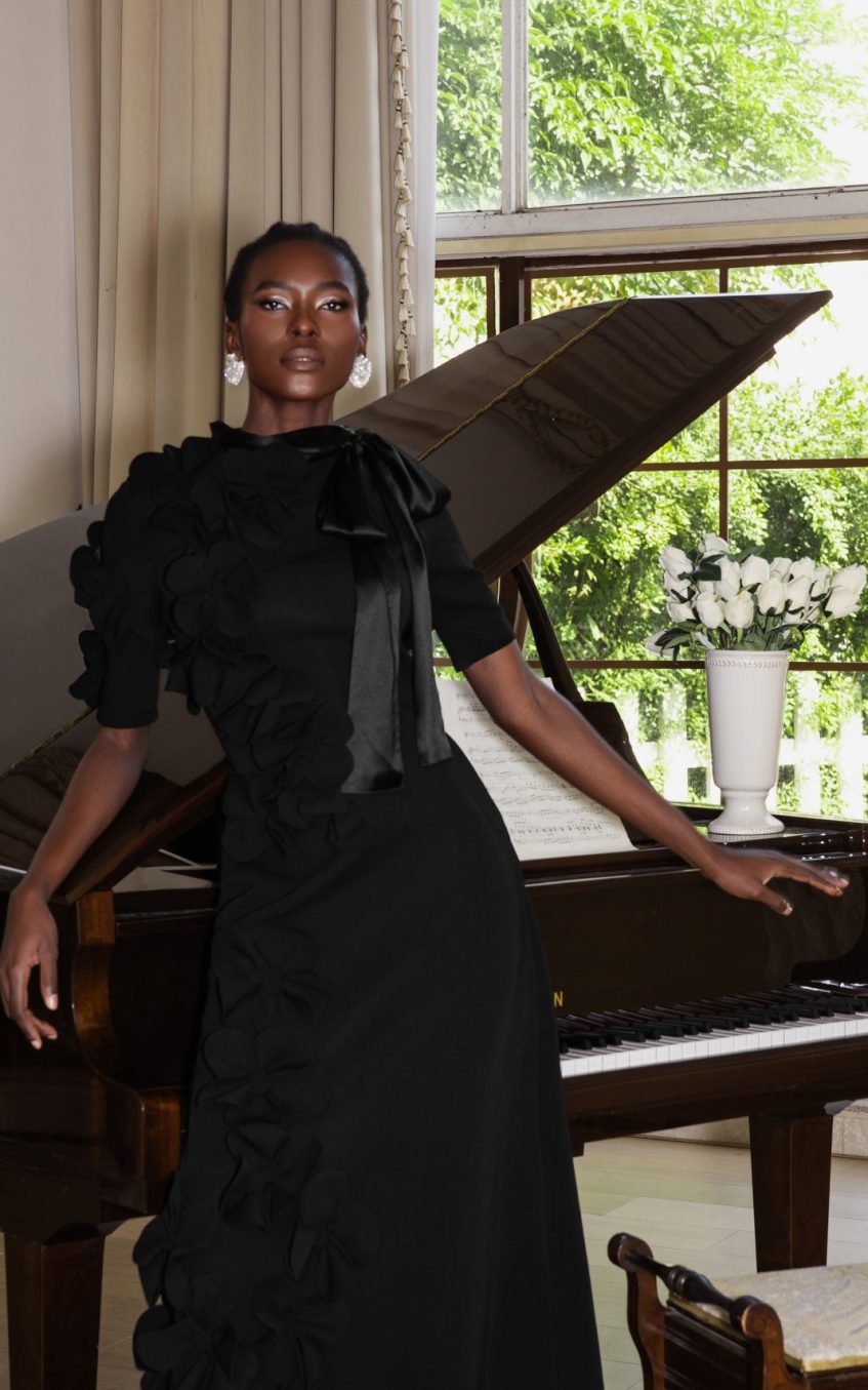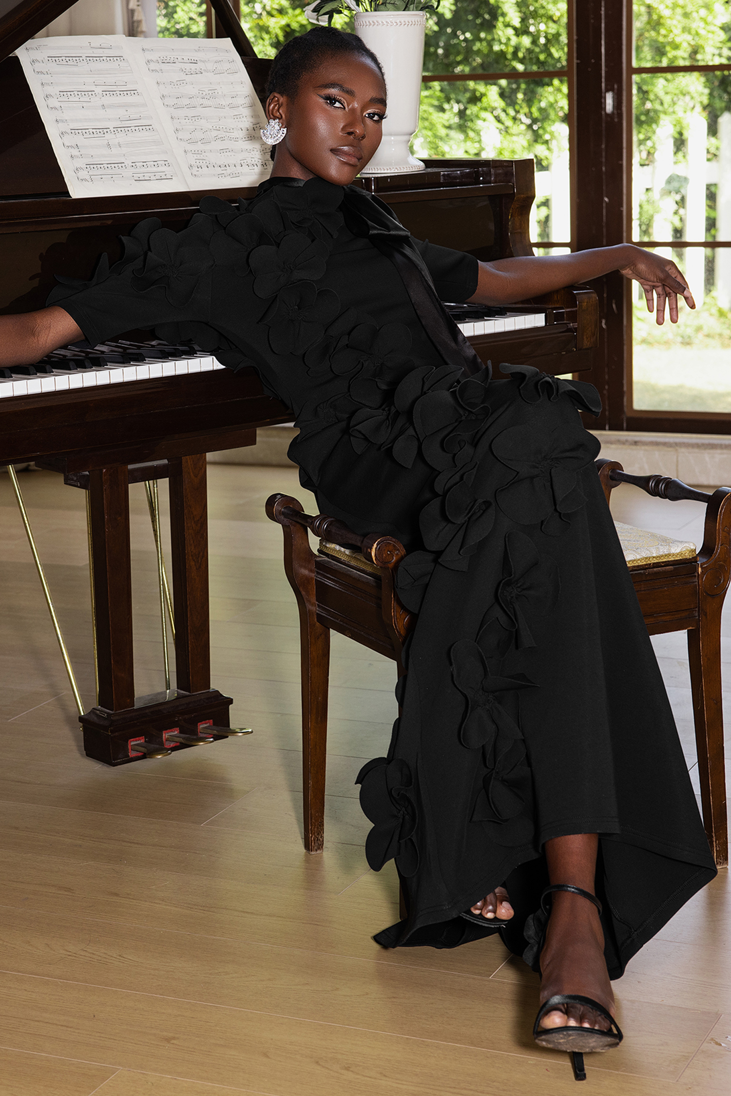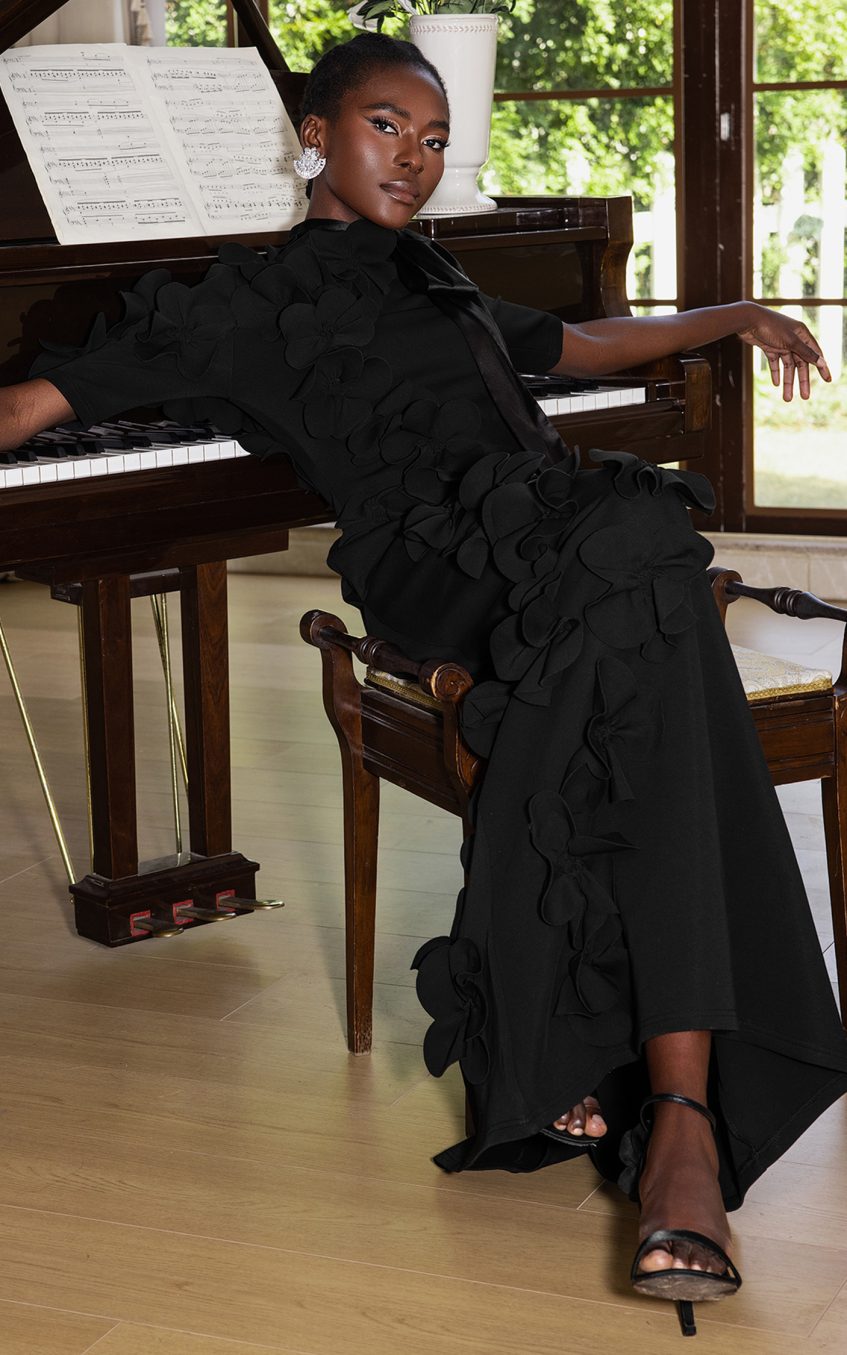 - Solid color. black. 3D flower. lace up. mid sleeve. maxi dress