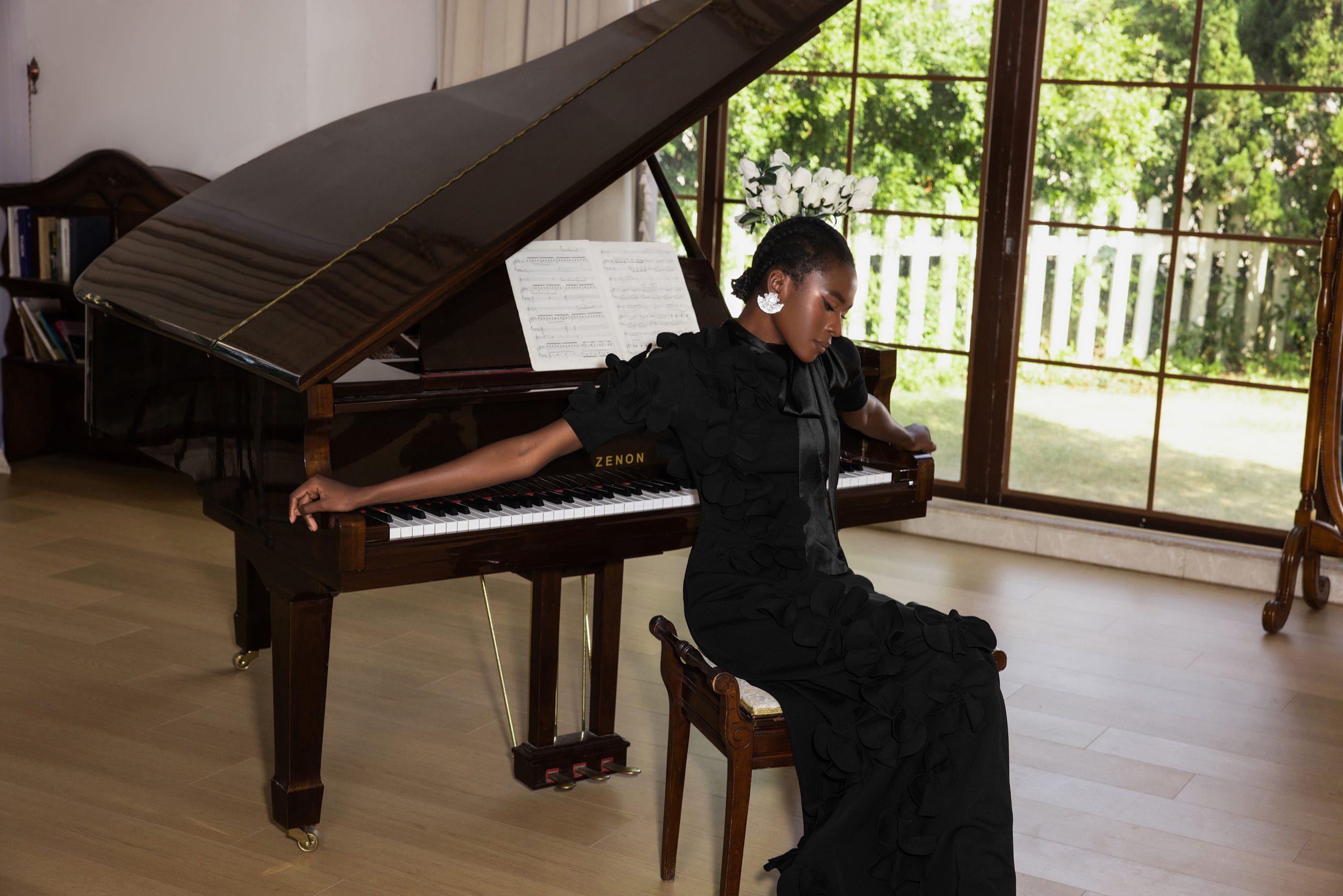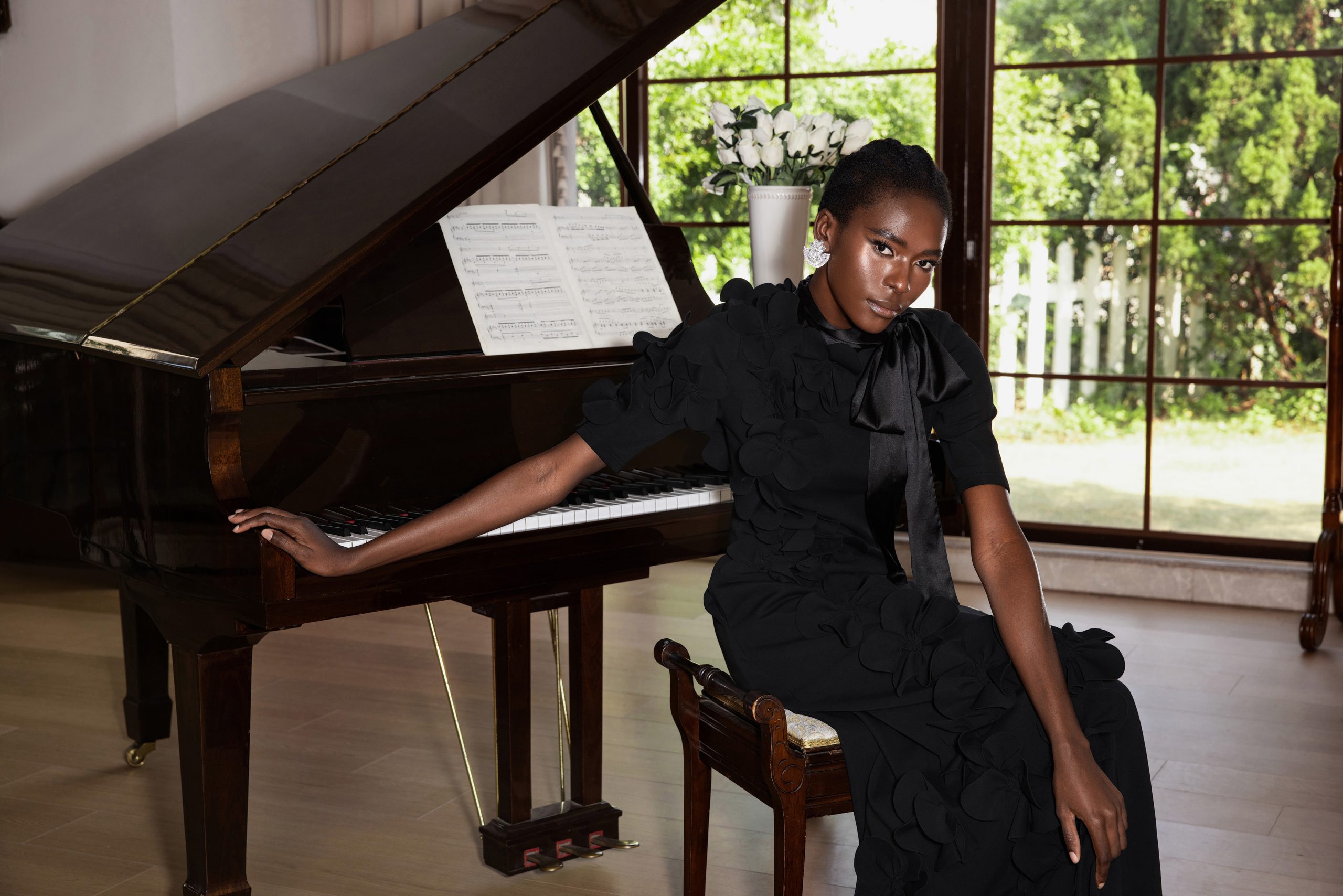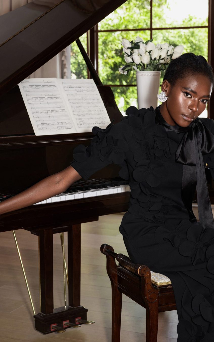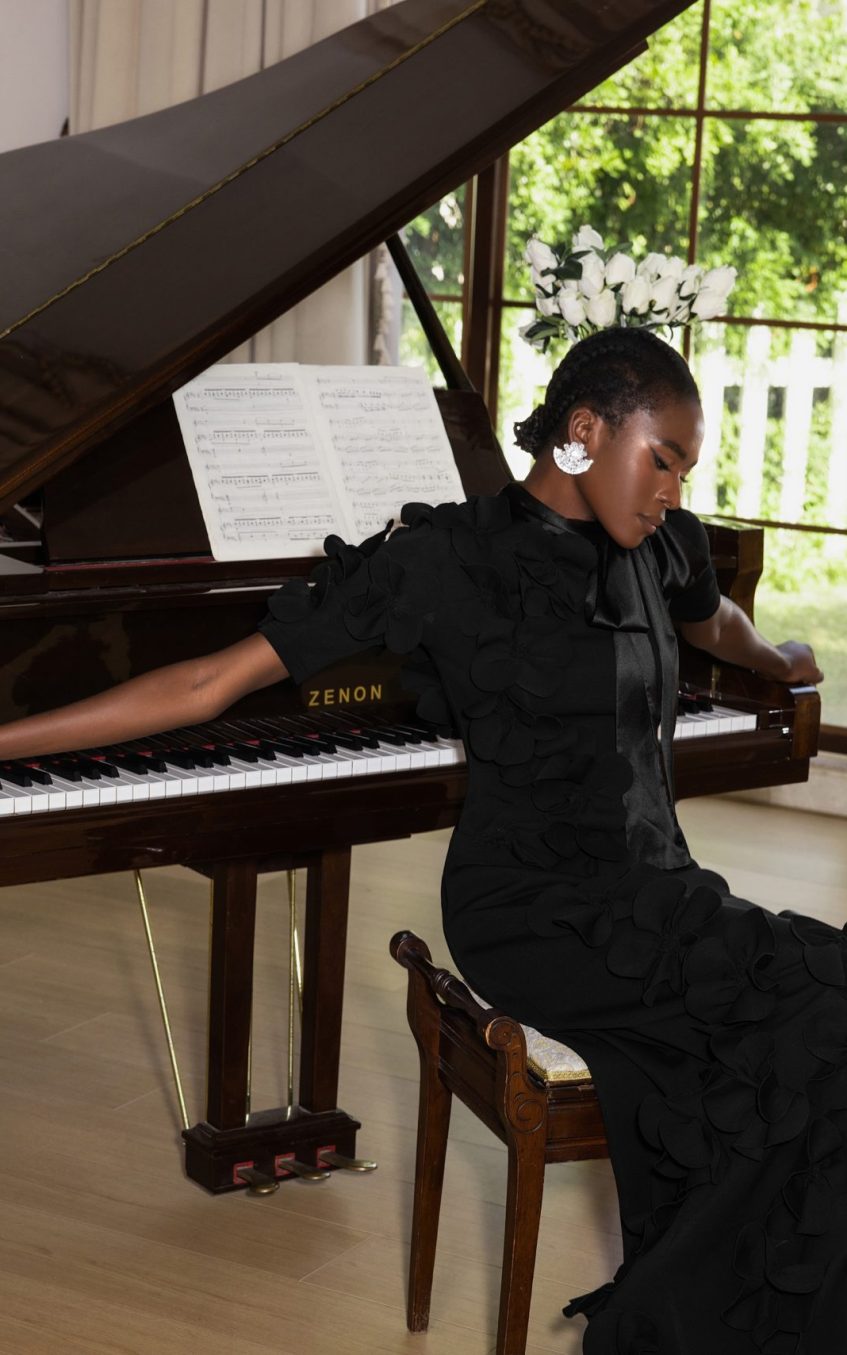 - Solid color. black. 3D flower. lace up. mid sleeve. maxi dress
