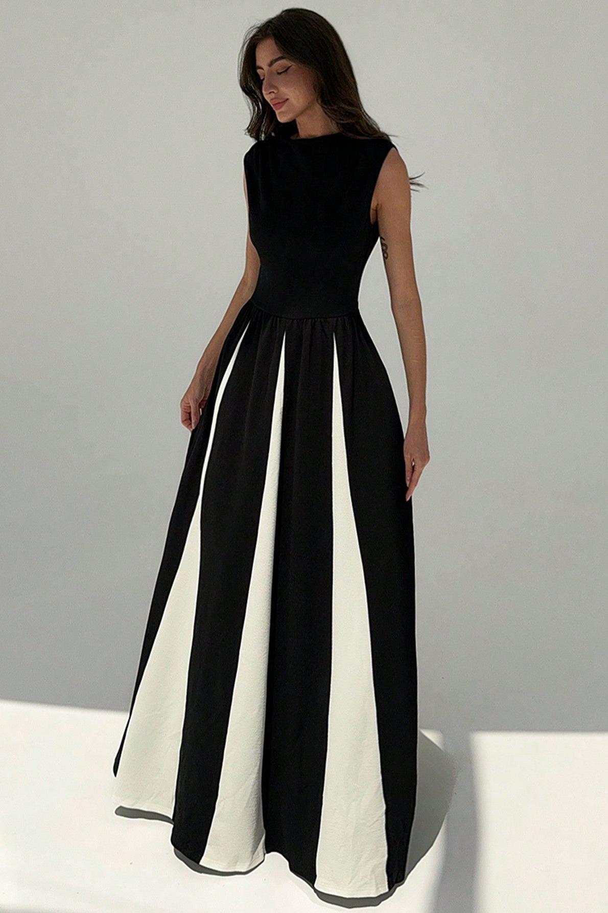 - Sleeveless. contrast color. black. white. round neck. midi dress