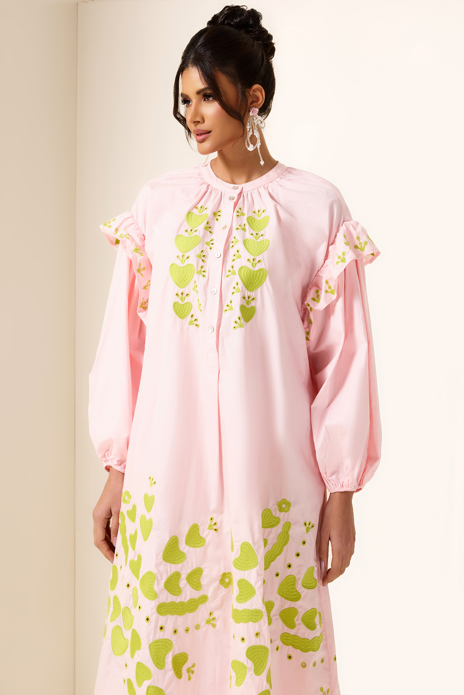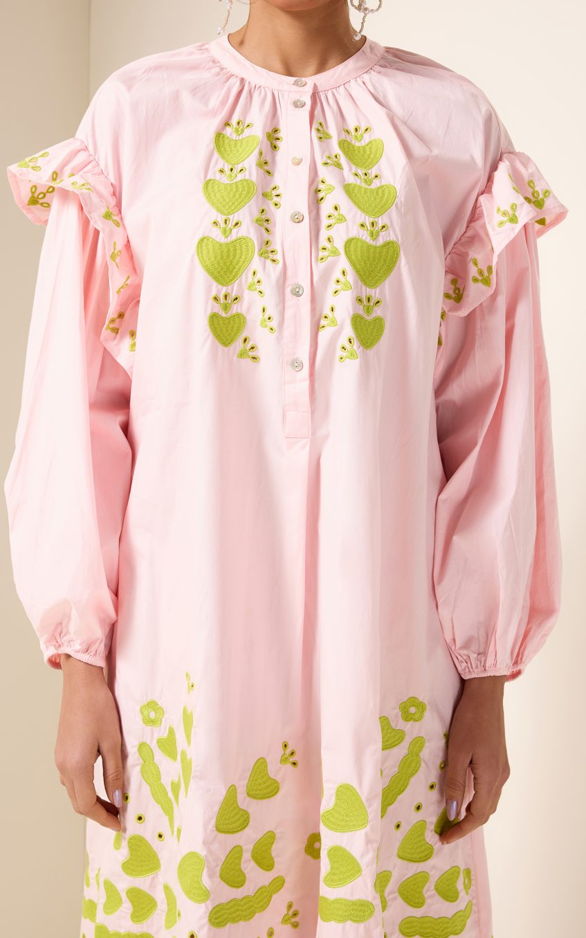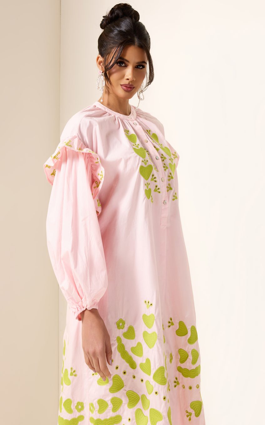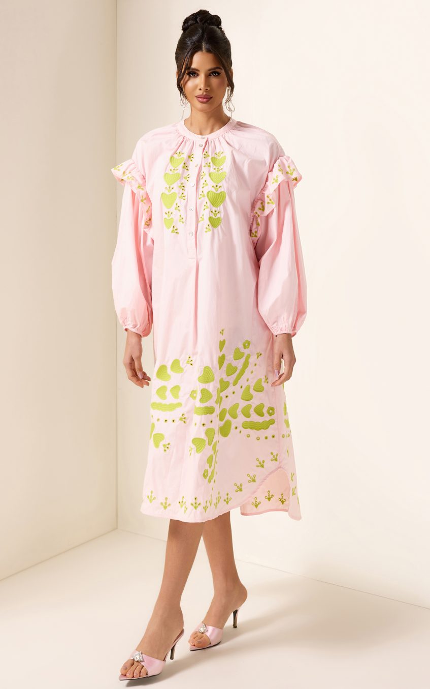 - Long sleeve. pink. embroidered. lantern sleeve. midi dress
