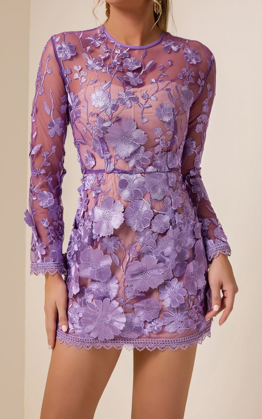 - Long sleeve. solid color. flower. purple. round neck. mini dress