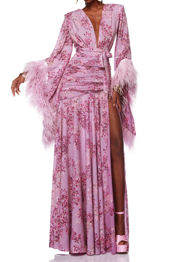 - Long sleeve. floral print. pink. feather. high split. maxi dress
