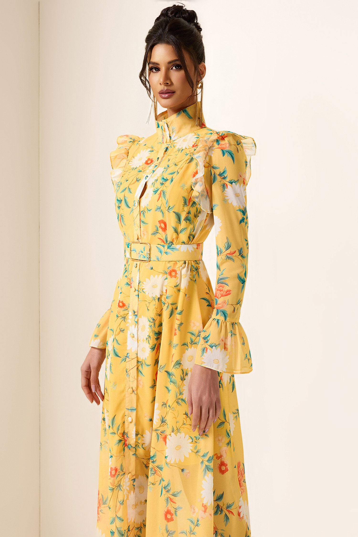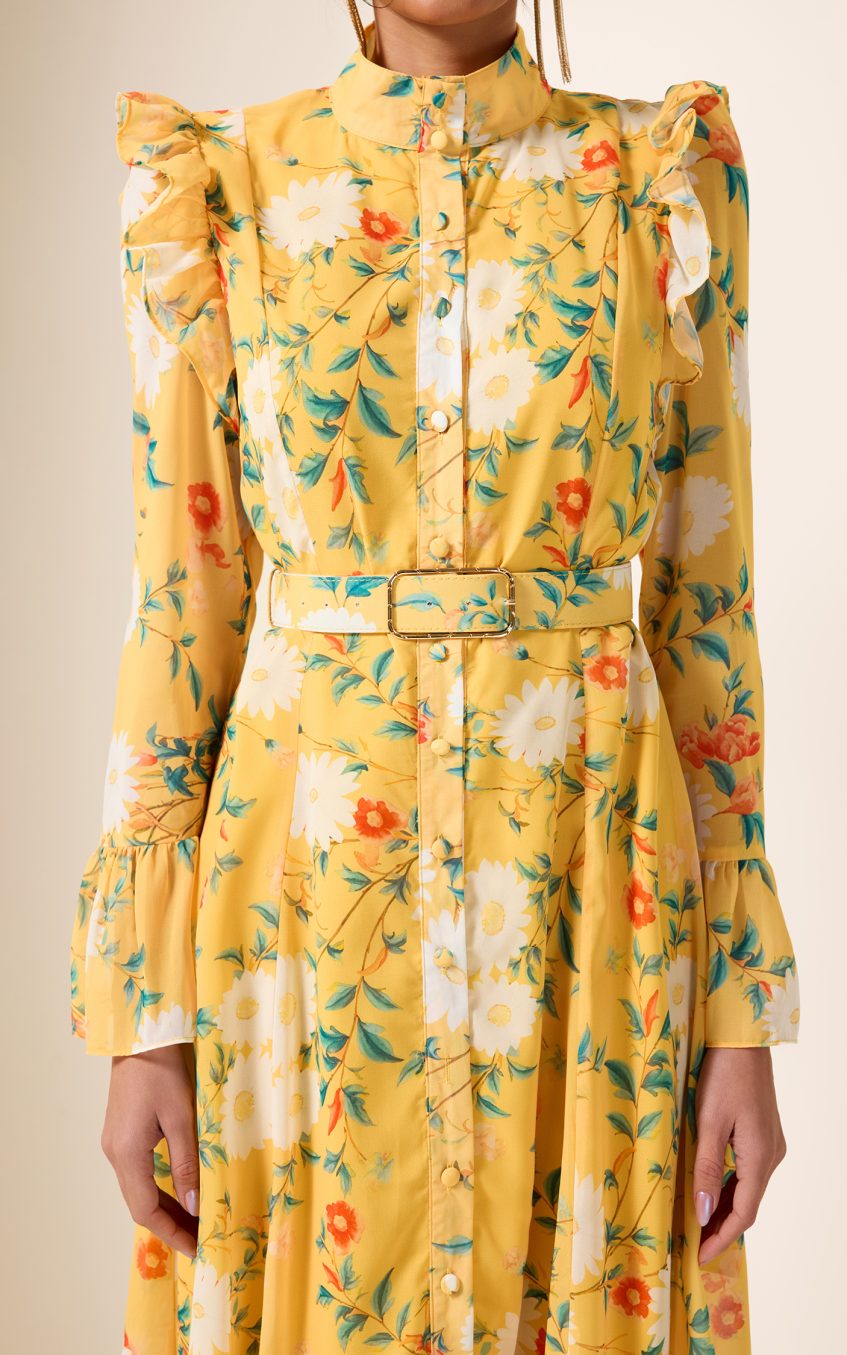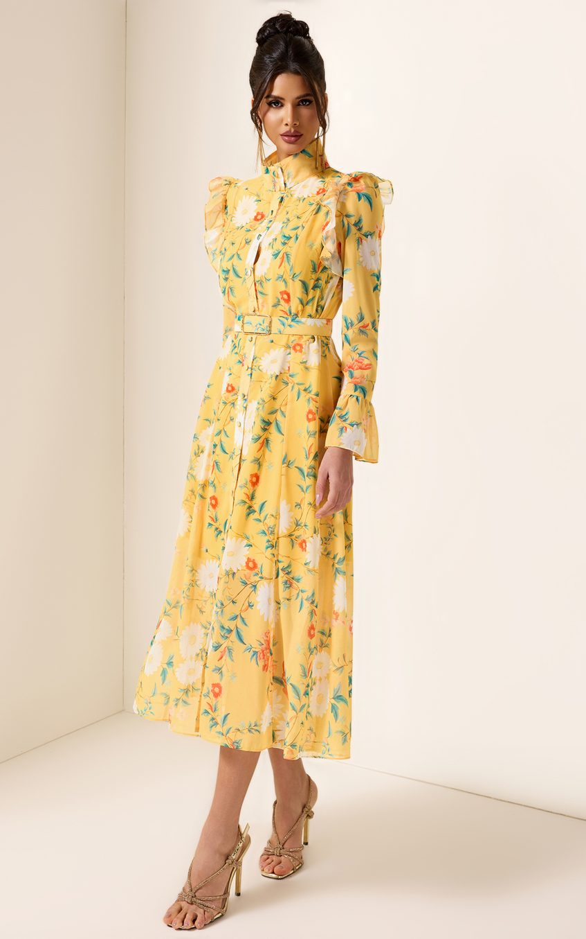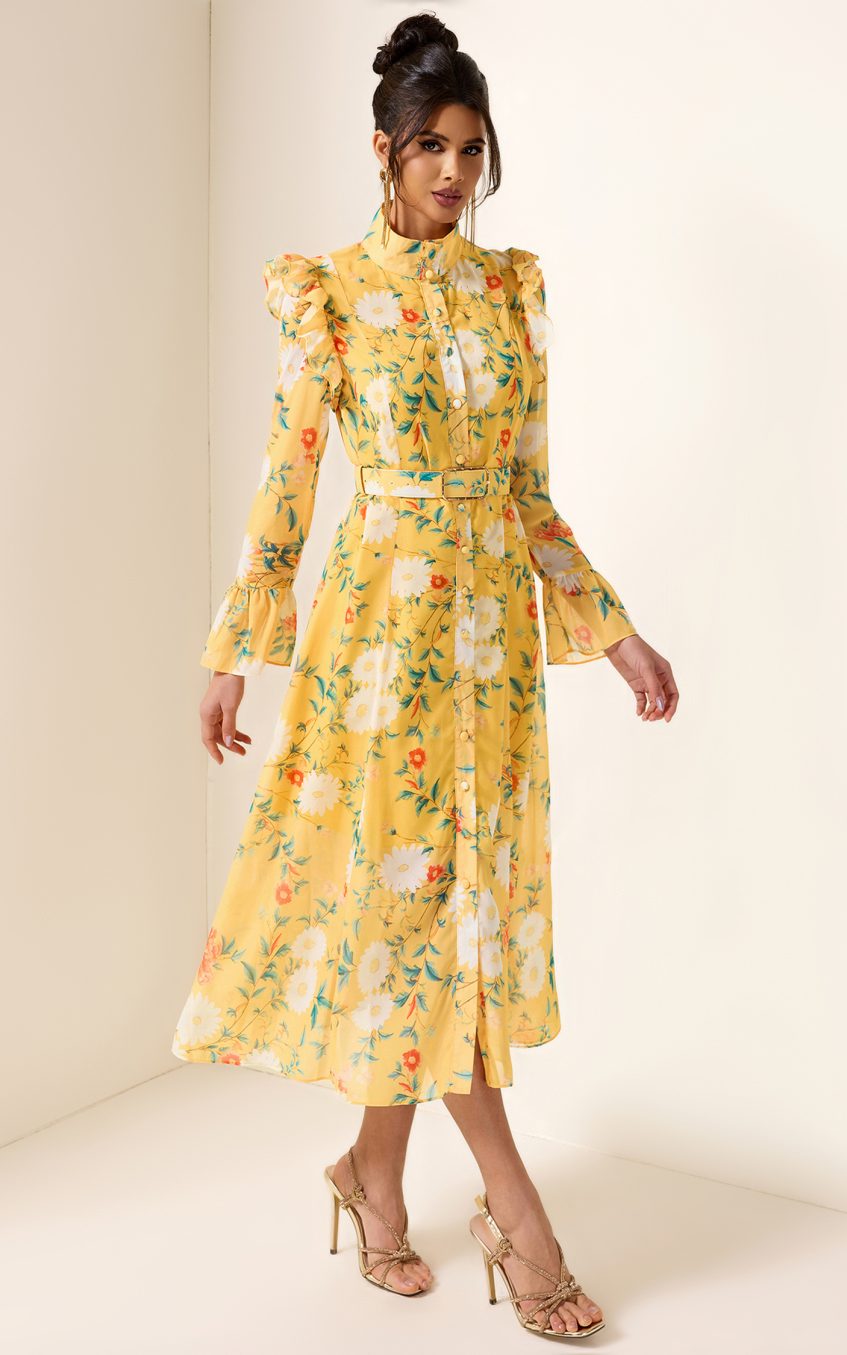- Long sleeve. floral print. yellow. frill butterfly sleeve. with belt. midi dress