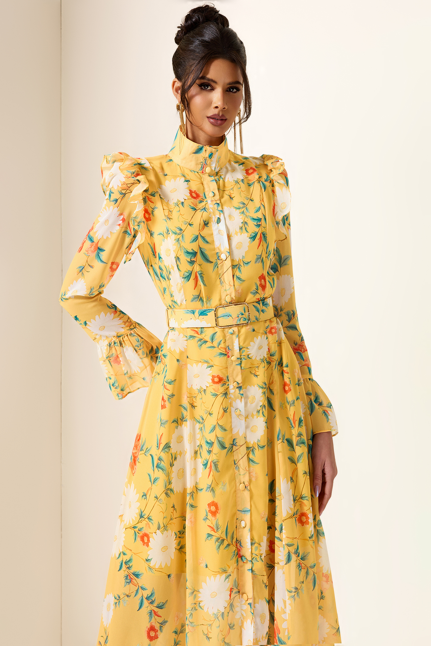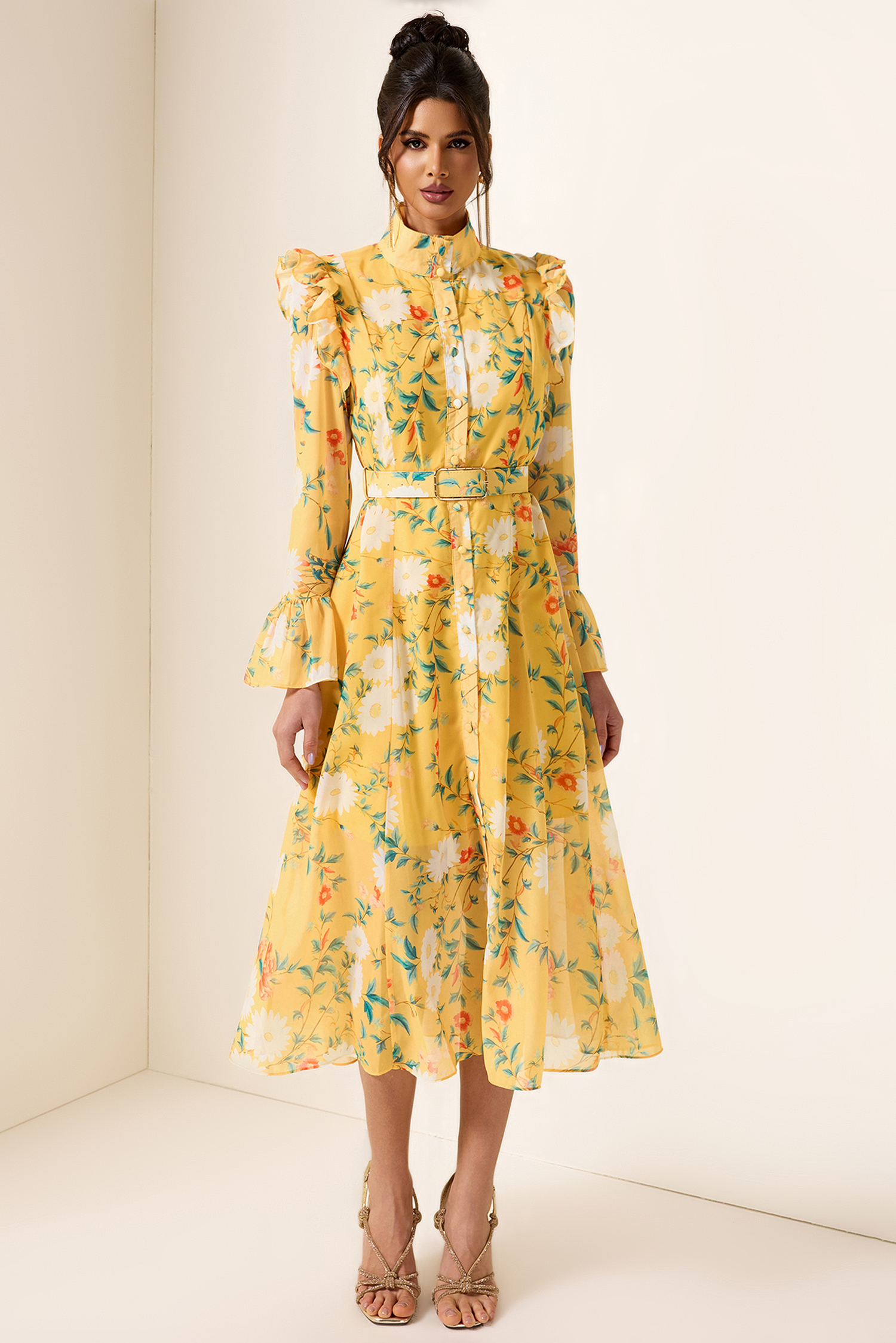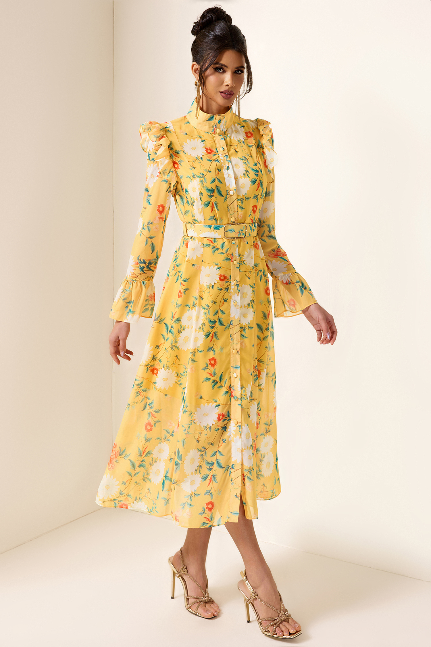 - Long sleeve. floral print. yellow. frill butterfly sleeve. with belt. midi dress