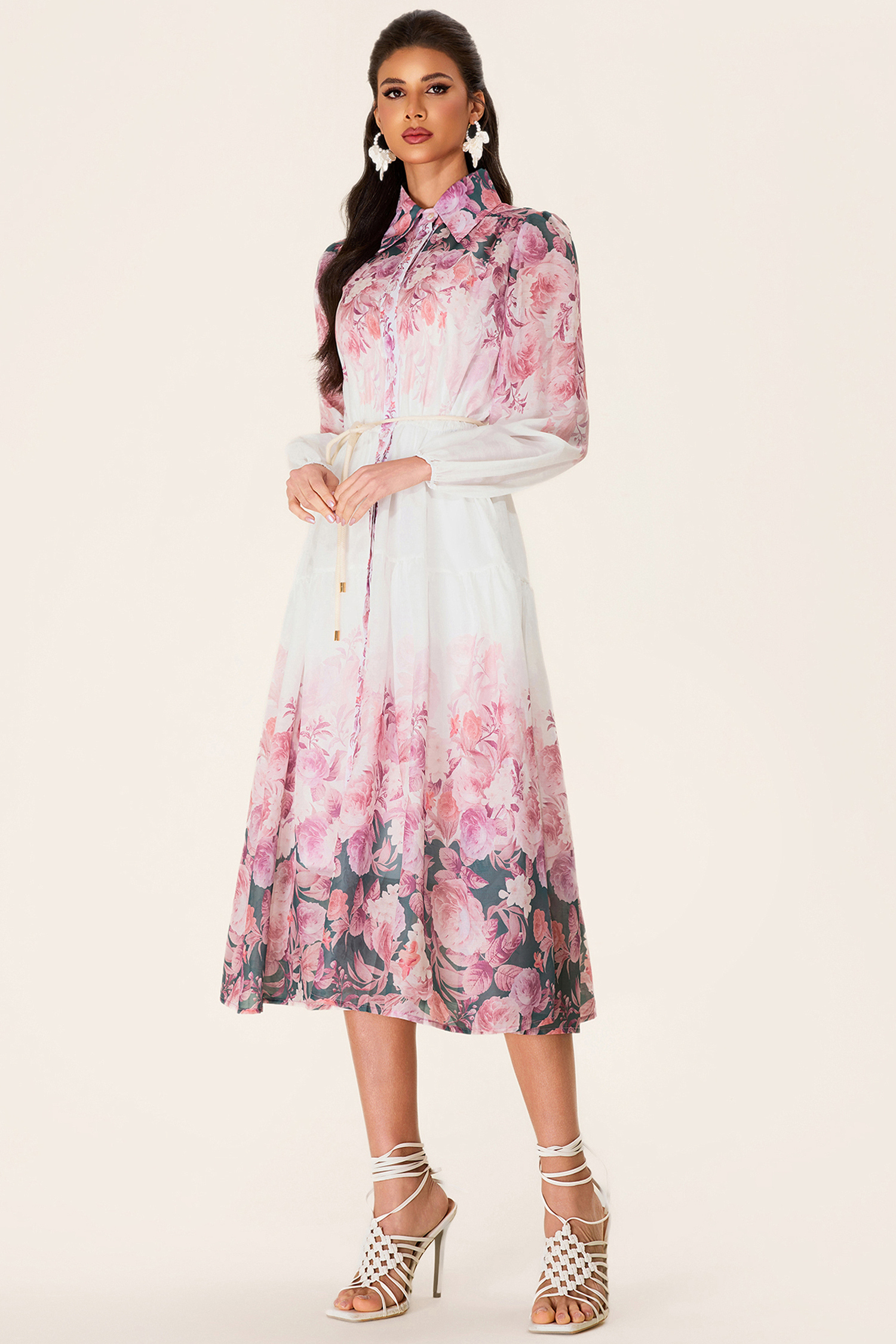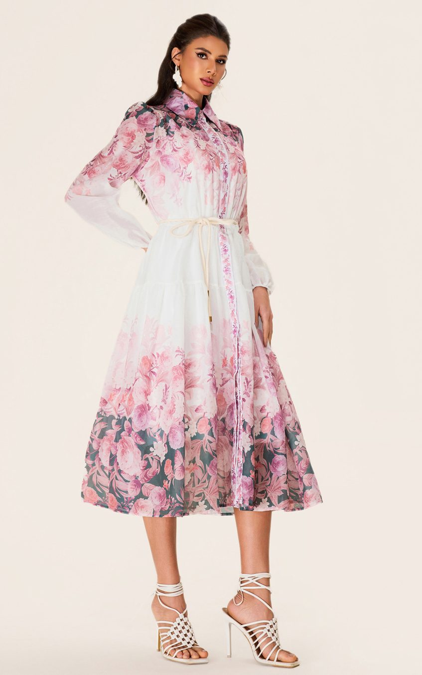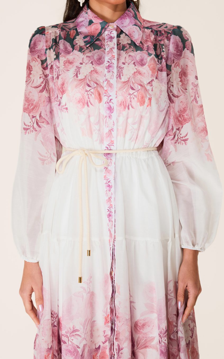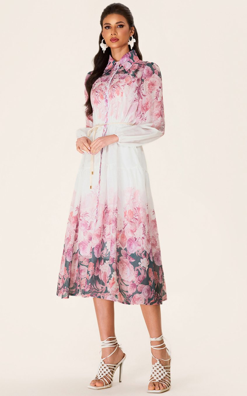 - Long sleeve. white. floral printed. shirt collar. midi dress