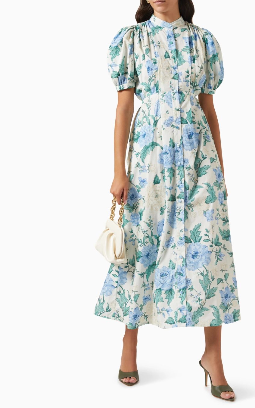 Floral Single Breasted Puff-Sleeve Midi Dress With Belt