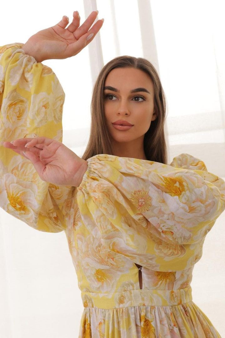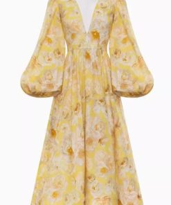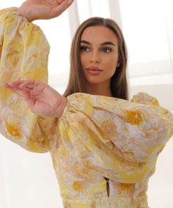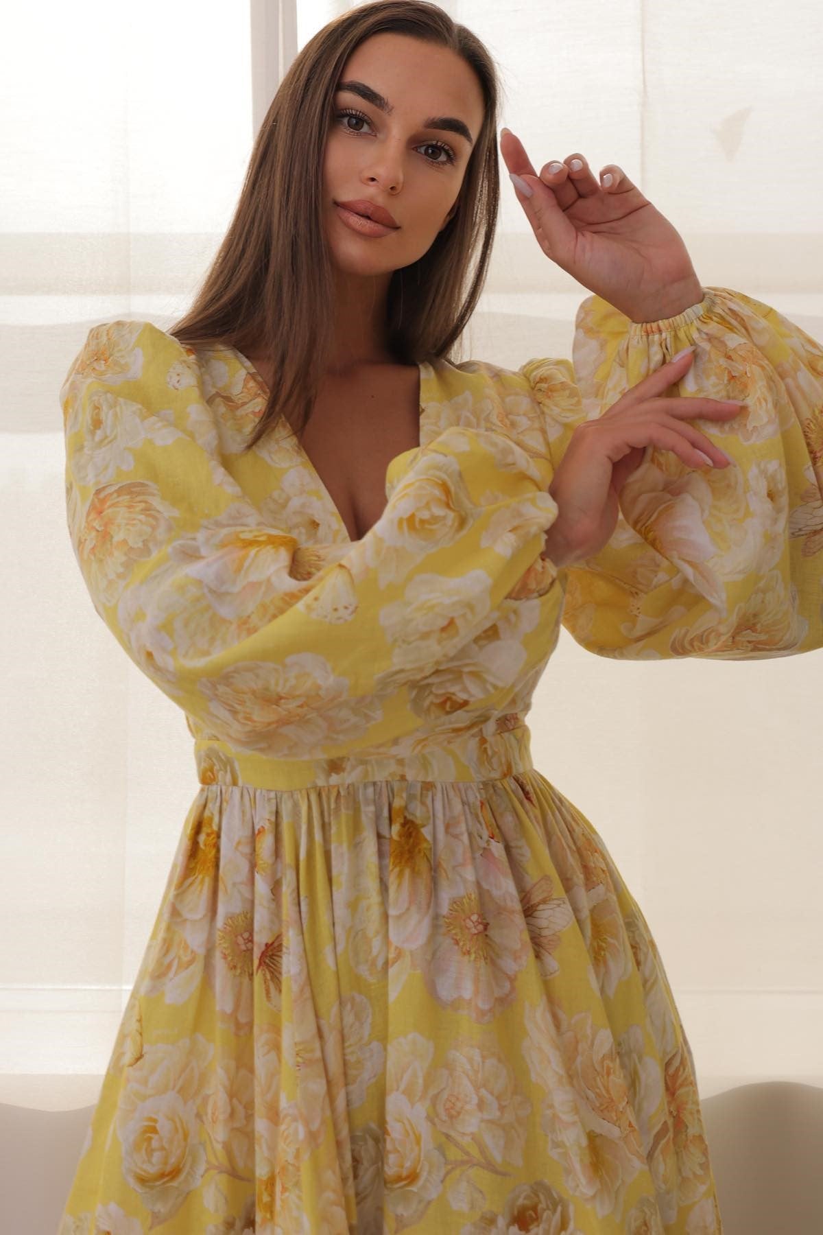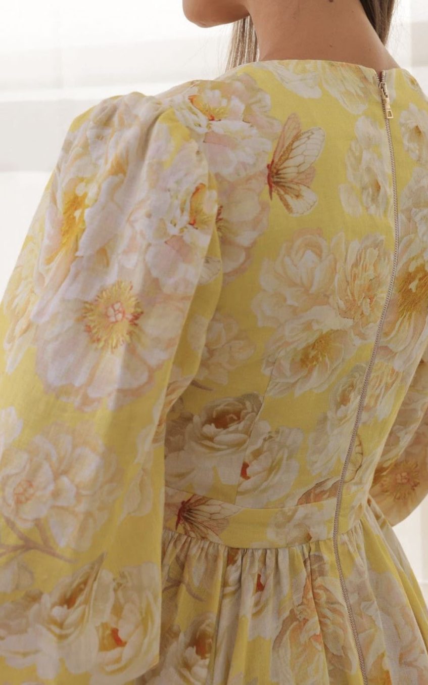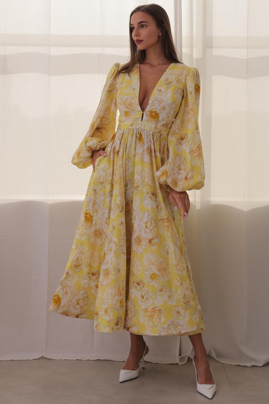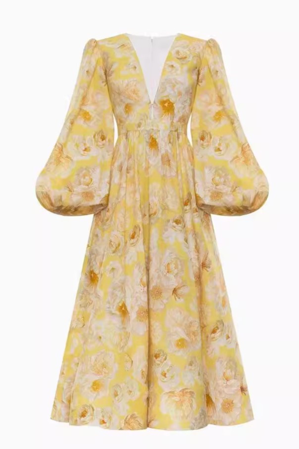 Tags: 202404, 20240410, autumn, Dress, floral printed, Lantern sleeve, long sleeve, midi dress, New Chart, picnic, PRE-E, spring, V-Neck, Vacation, WH, Yellow