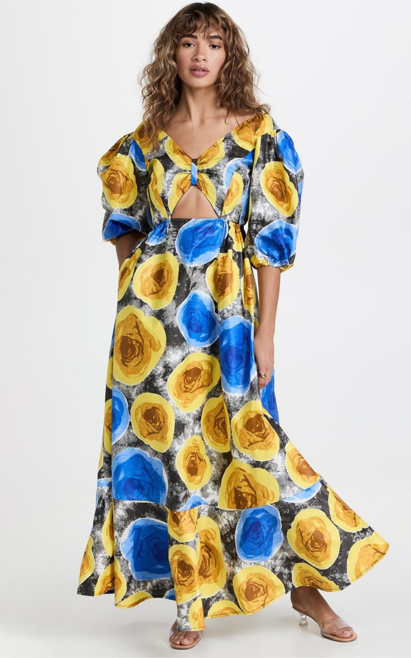 Floral V-Neck Puff Sleeve Cut-Out Midi Dress