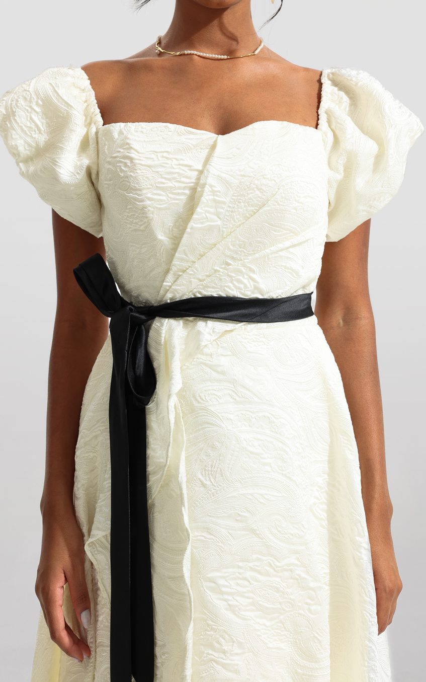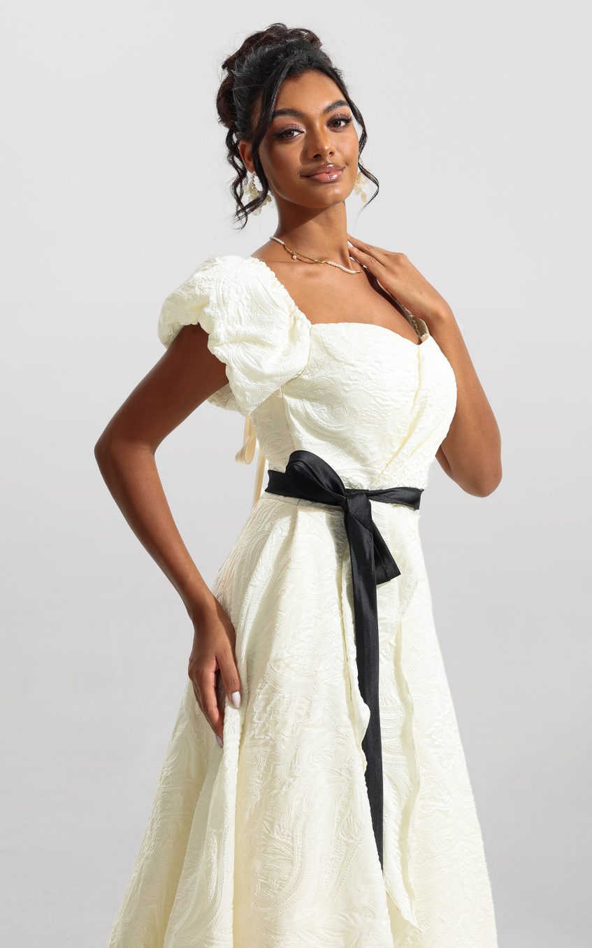 - Puff sleeve. sweetheart neck. belted. short sleeve