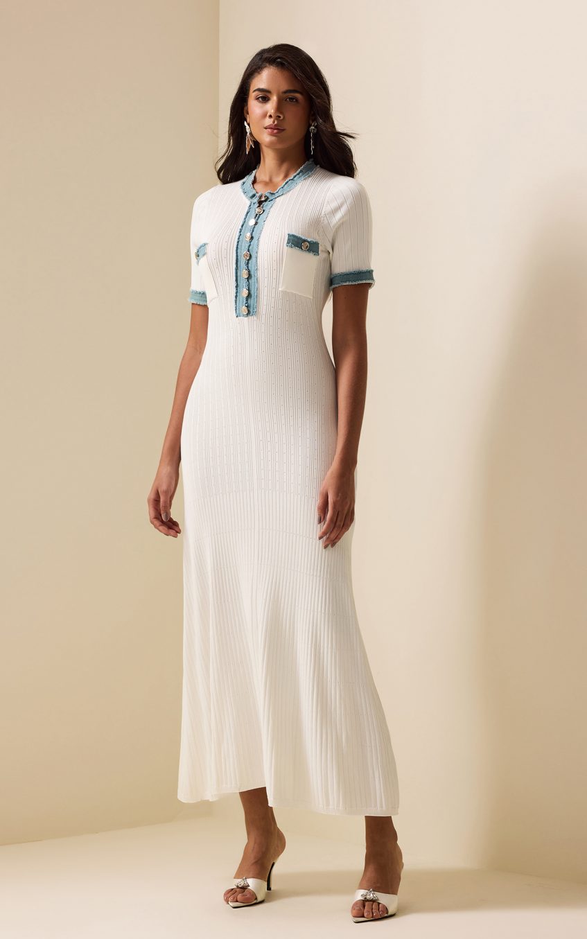 - Knit. denim. contrast color. midi dress. white. short sleeve
