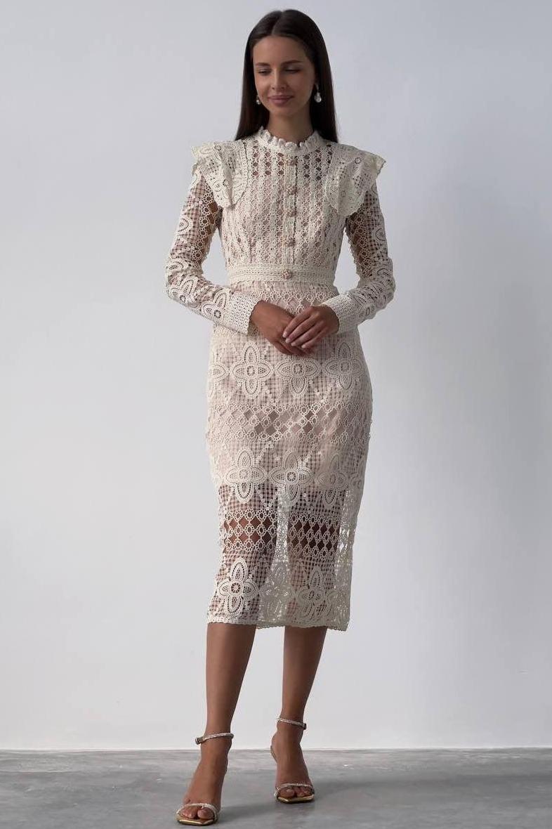Tags: 202504, 20250410, Button, date, Dress, Faux Pearl, Lace, long sleeve, midi dress, polyester, Solid Color, spring, White