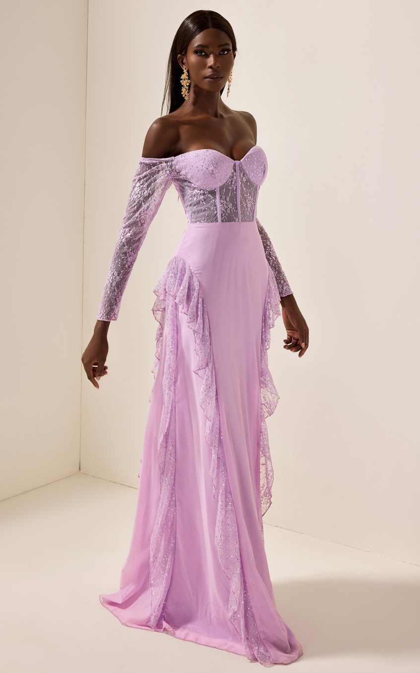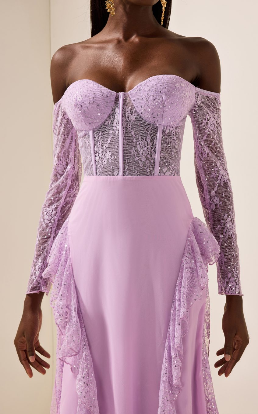 - Off-shoulder. long sleeve. solid color. lavender. lace. maxi dress
