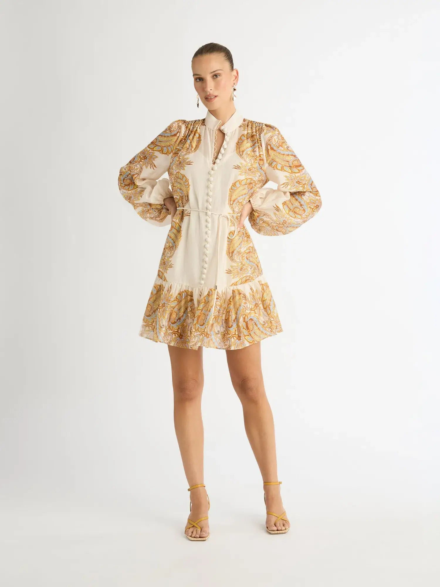 Tags: 202402, 20240229, CTS, Dress, Lantern sleeve, long sleeve, Mini, mini dress, New Chart, Paisley, print, single-breasted, spring, summer, TF, Vacation, WH, Yellow