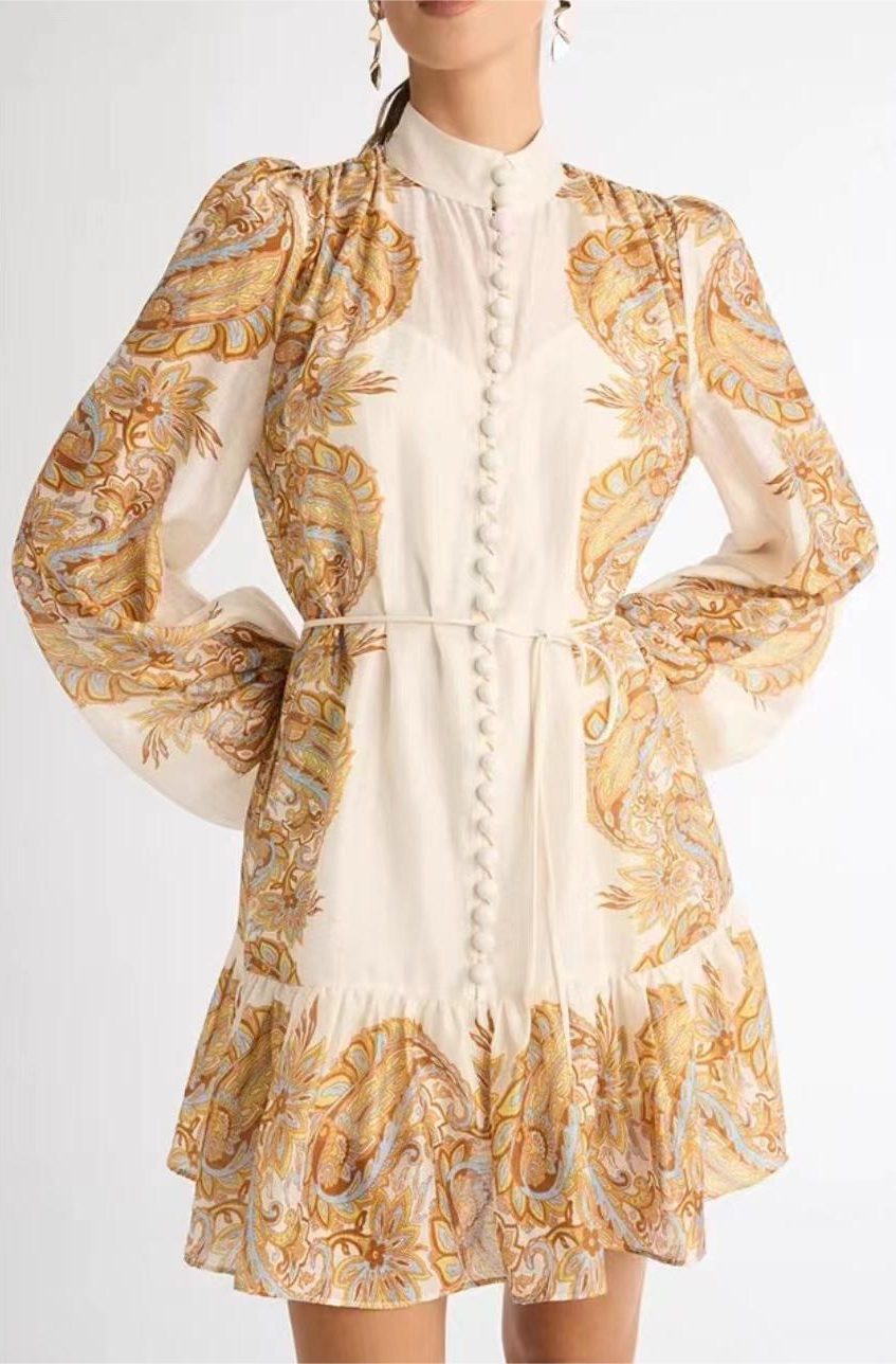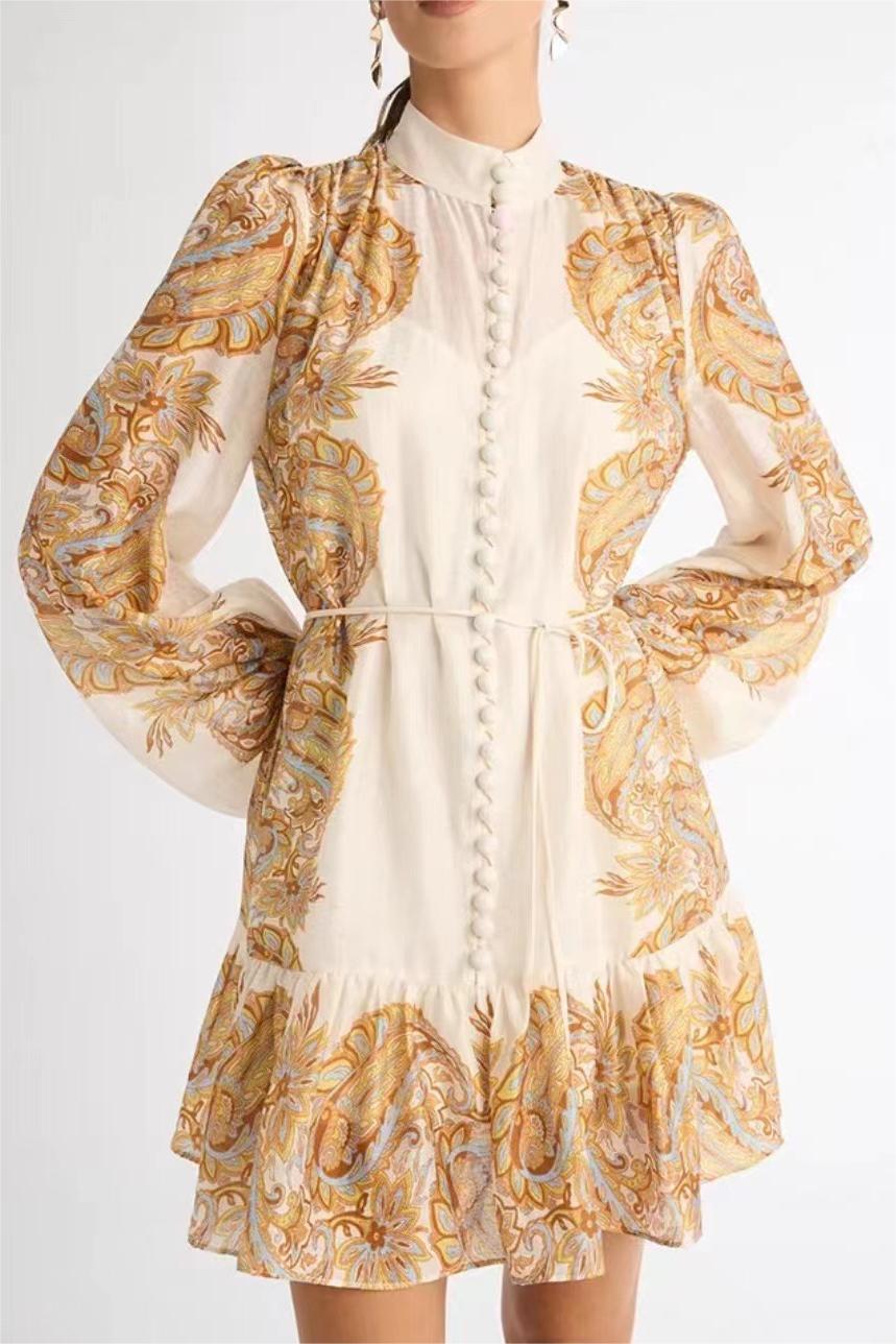 Paisley Single Breasted Lantern Sleeve Mini Dress