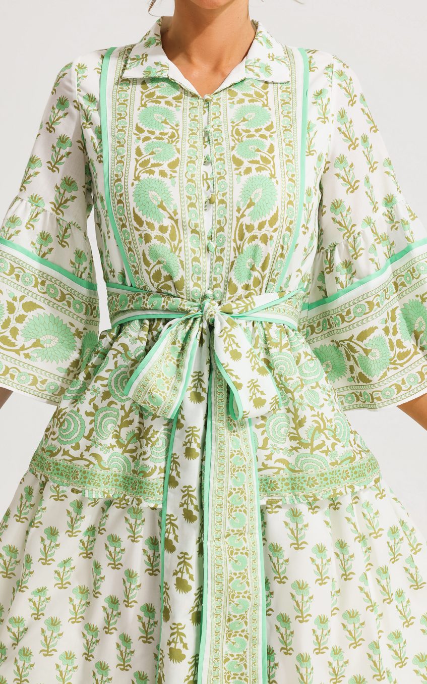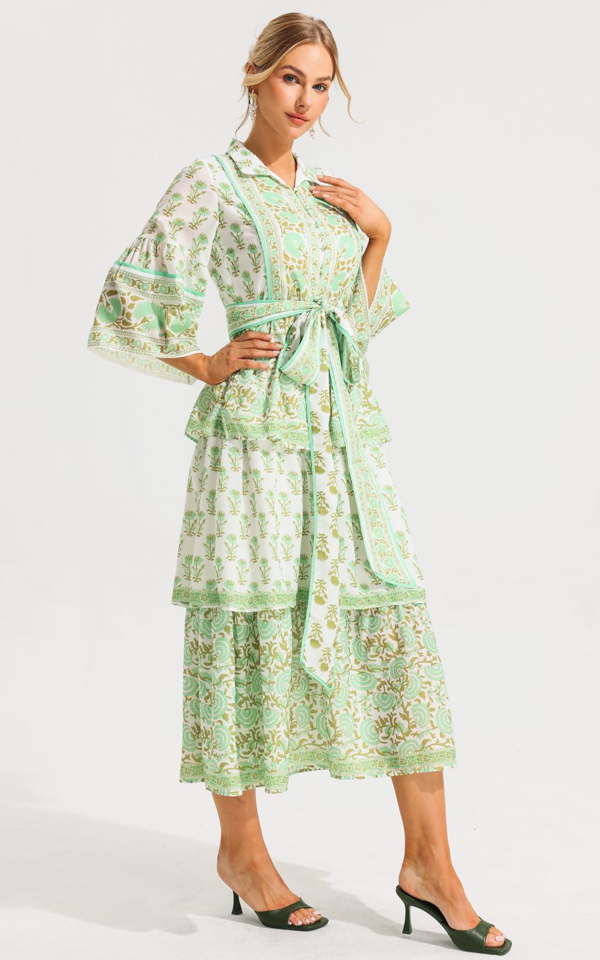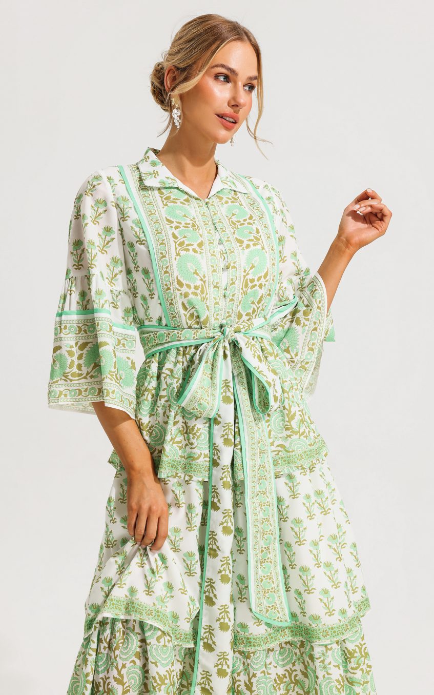 - Paisley. single -breasted. tiered hem. mid sleeve
