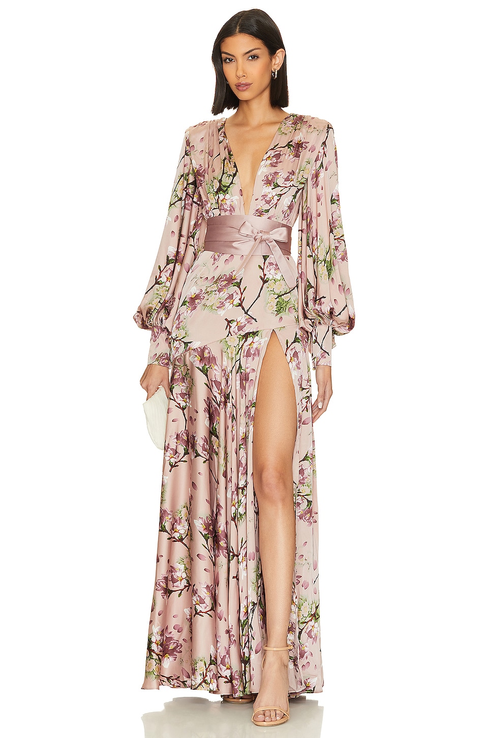 - Long sleeve. floral print. v-neck. satin. lantern sleeve. pink. high split. maxi dress