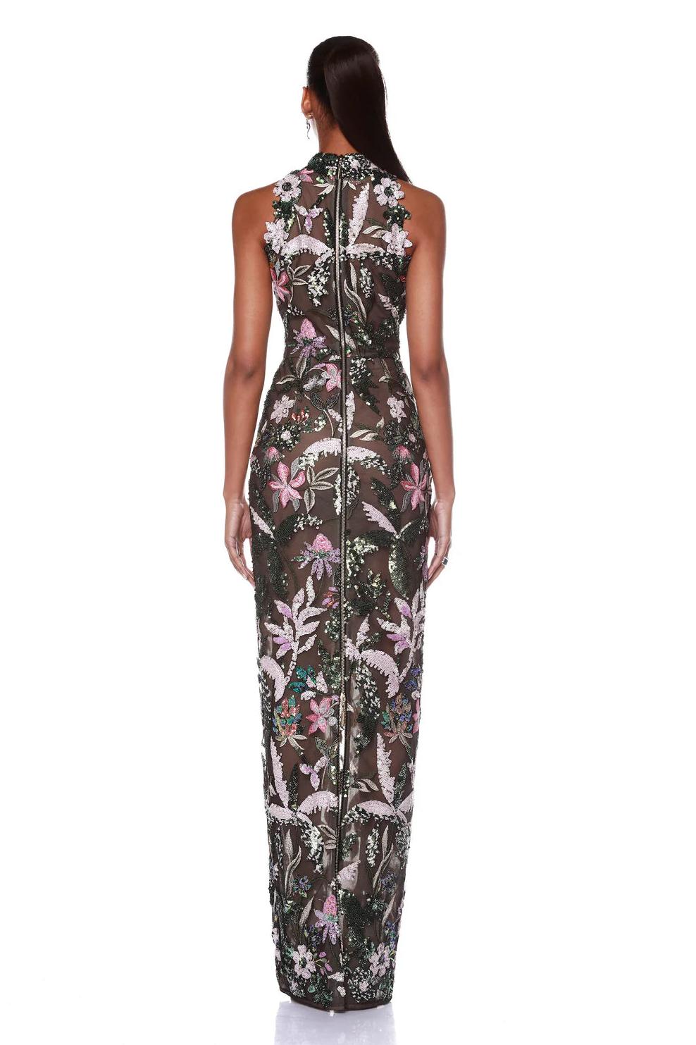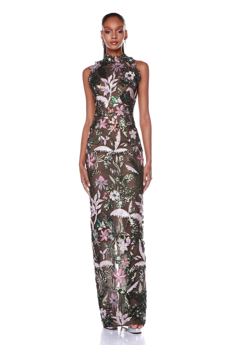 - Sleeveless. floral print. green. embroidered. sequin. maxi dress