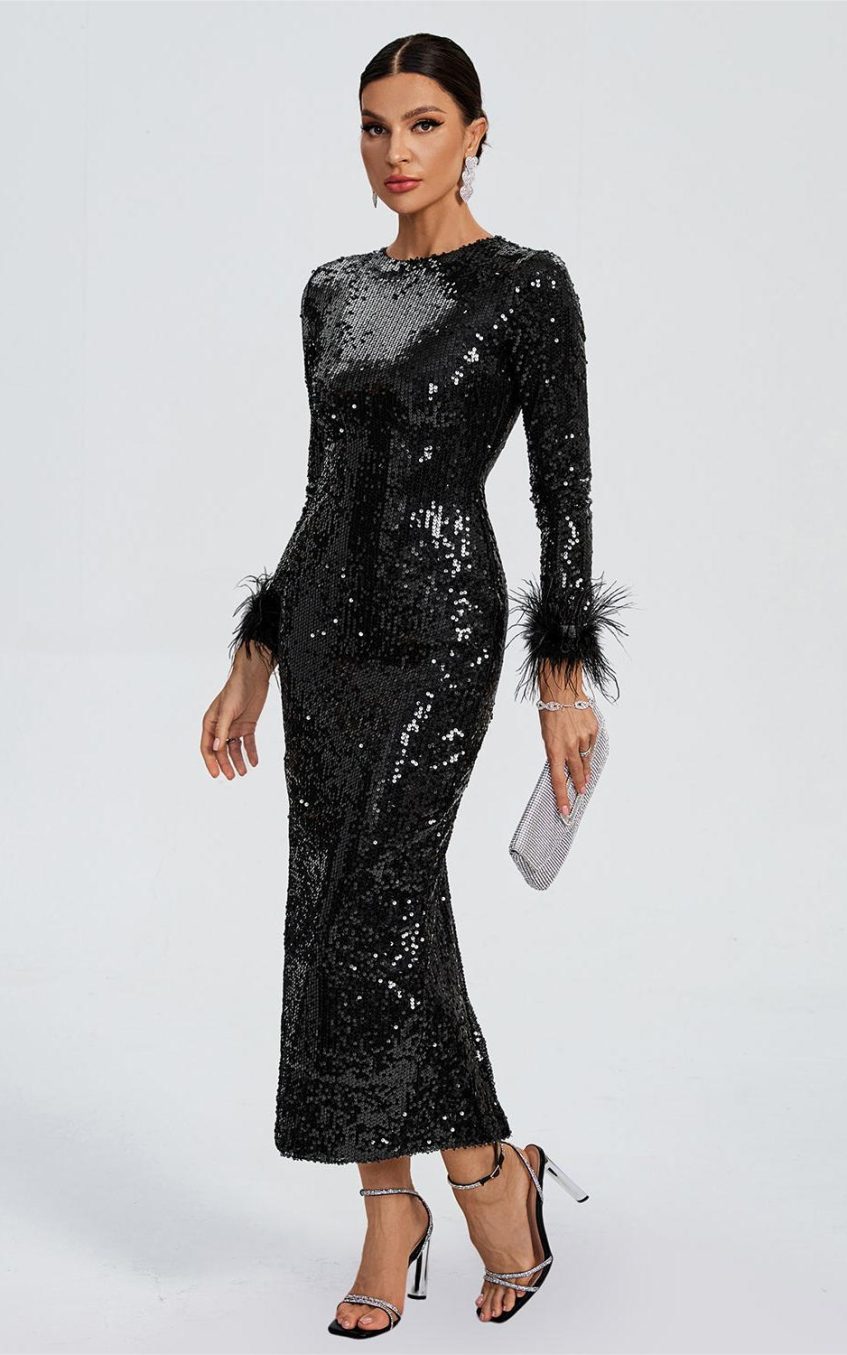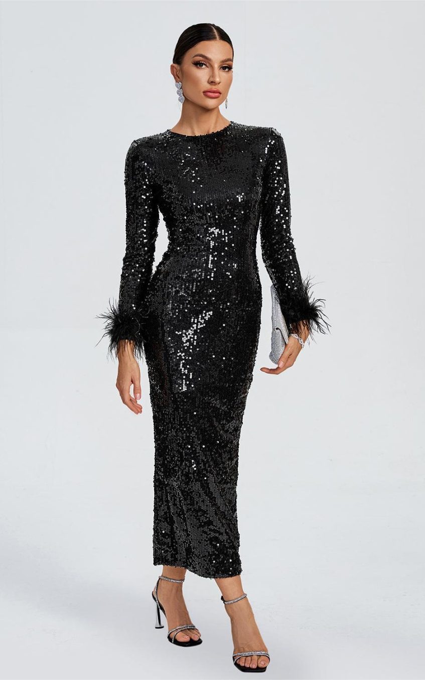 Tags: 202409, 20240930, autumn, Black, Dress, E, Feather, long sleeve, midi dress, Party, sequin