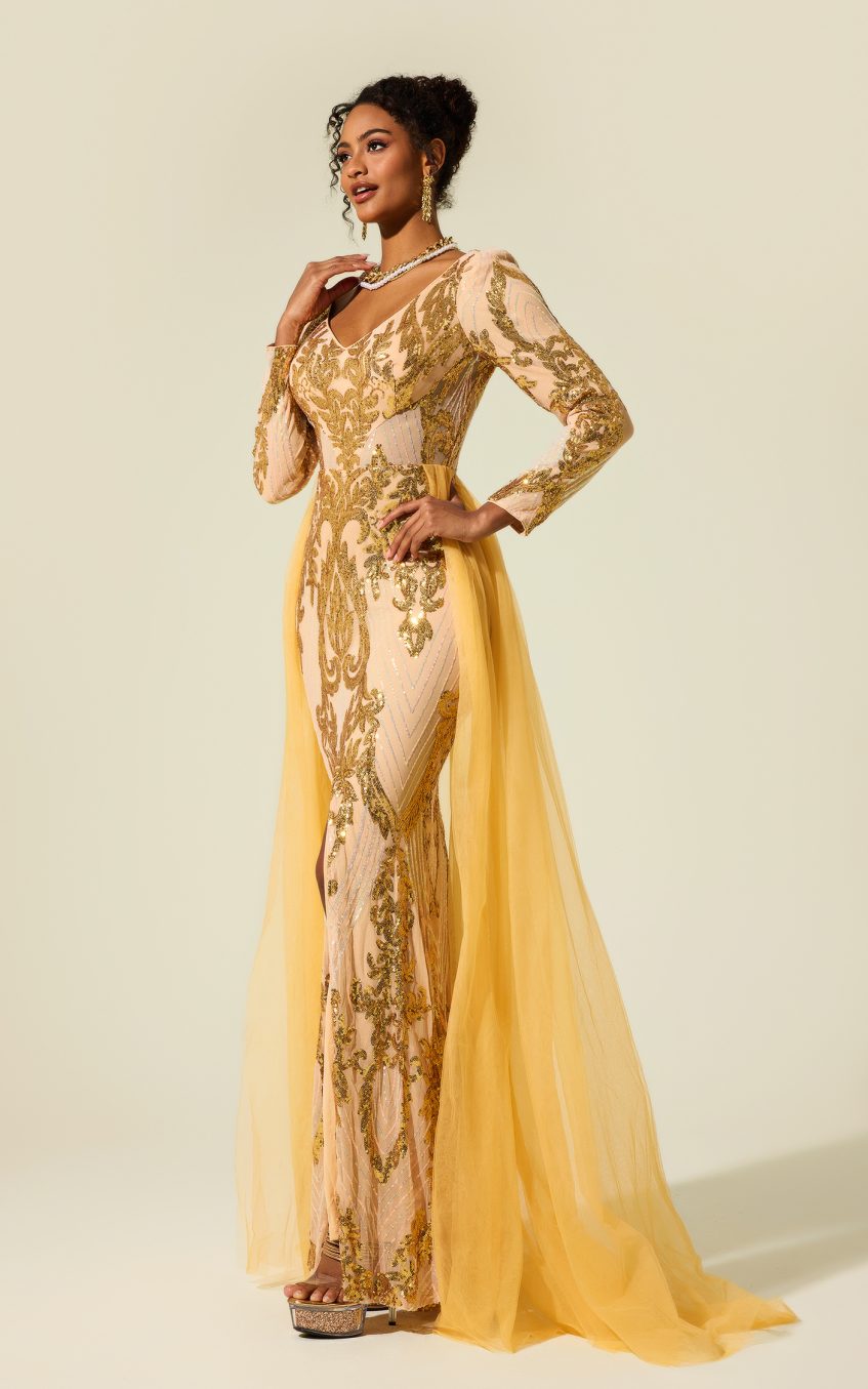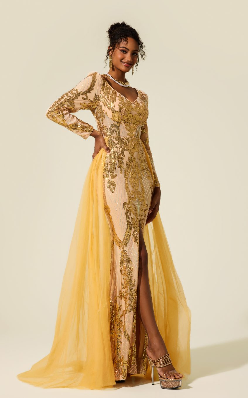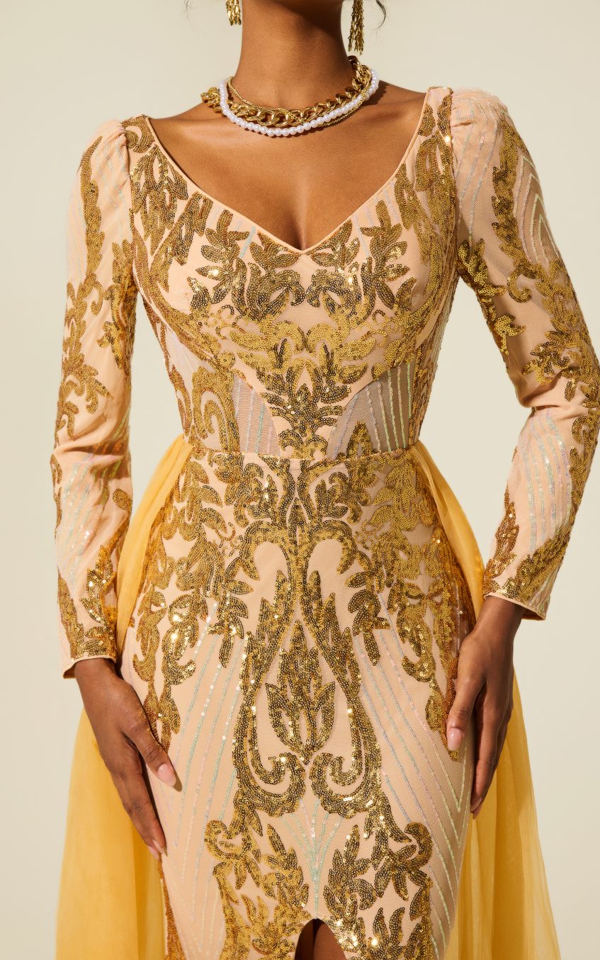 - Long sleeve. v-neck. gold. solid color. maxi dress