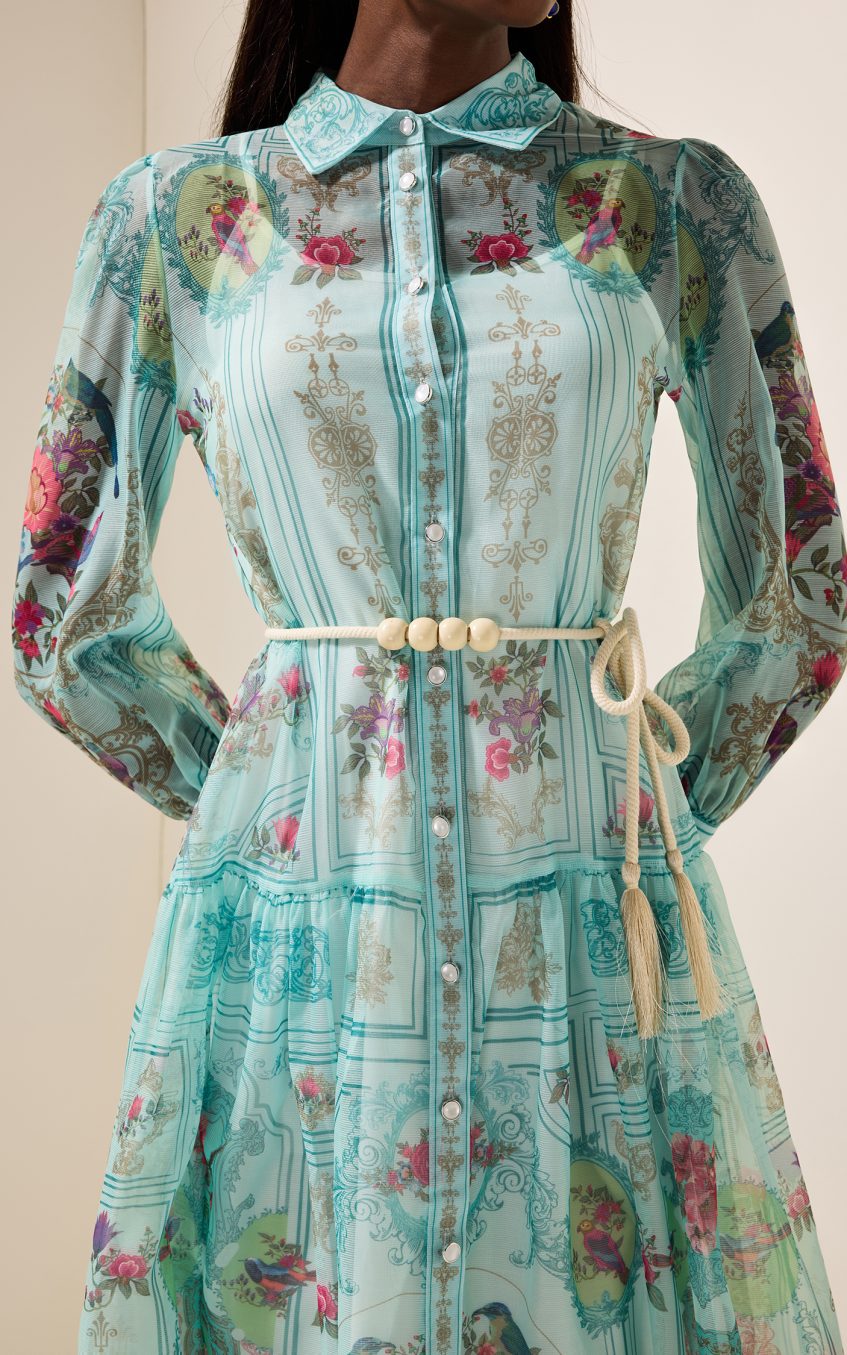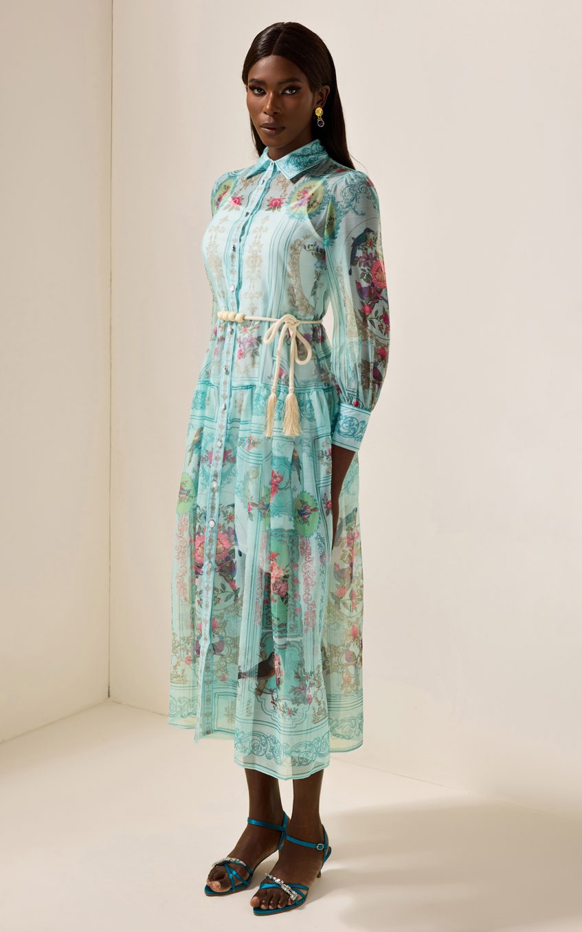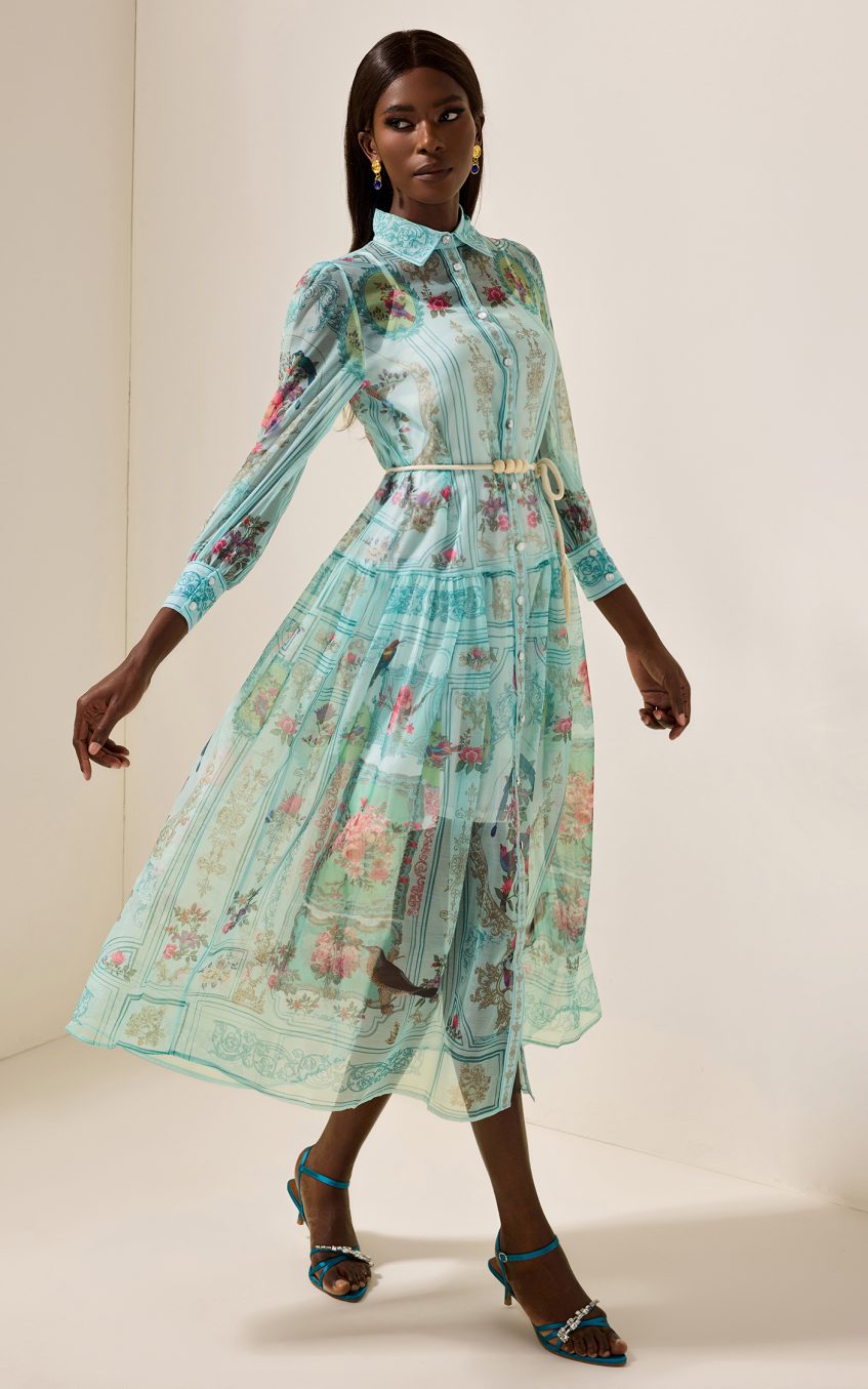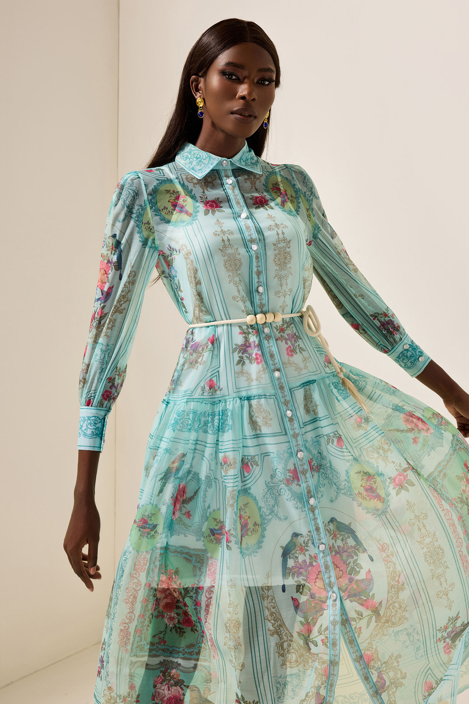 - Long sleeve. lantern sleeve. light green. shirt collar. floral print. midi dress