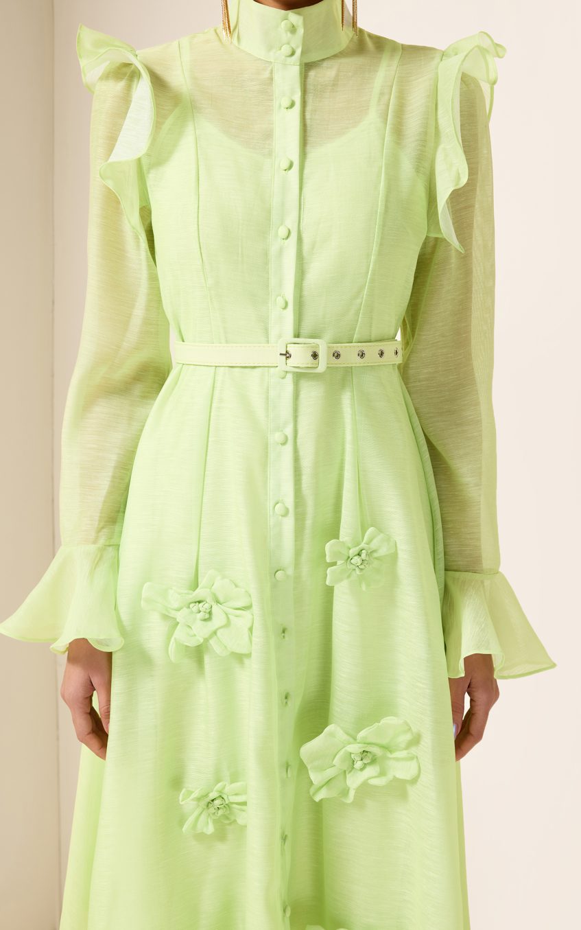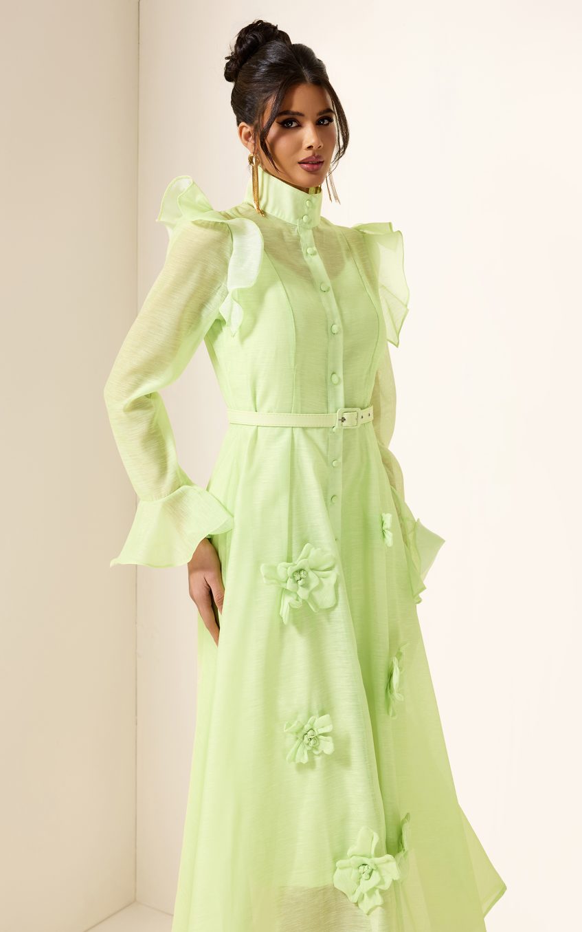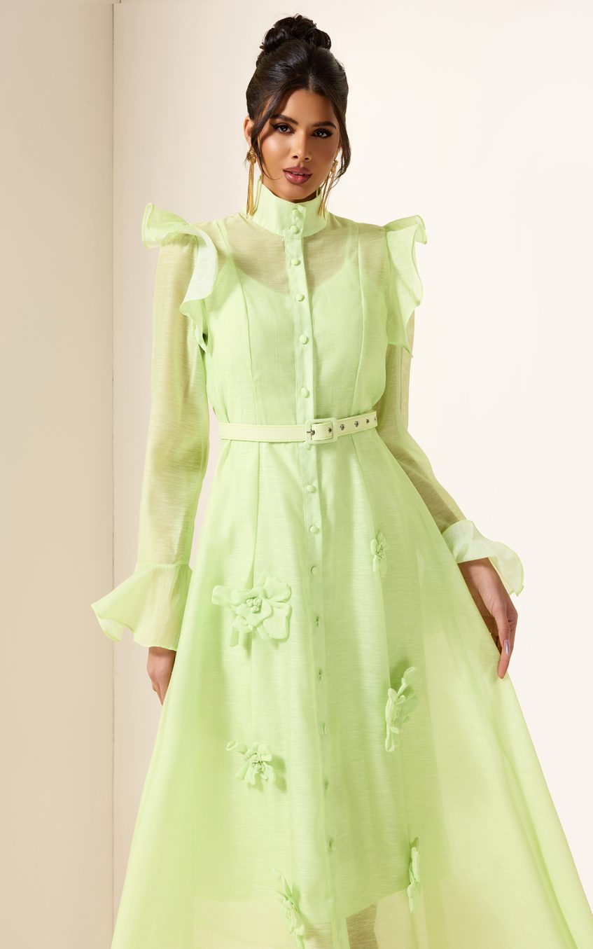 - Long sleeve. solid color. light green. 3D floral. frill. midi dress