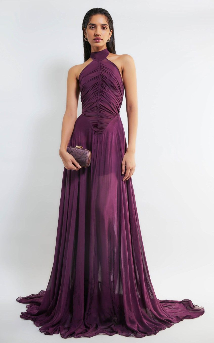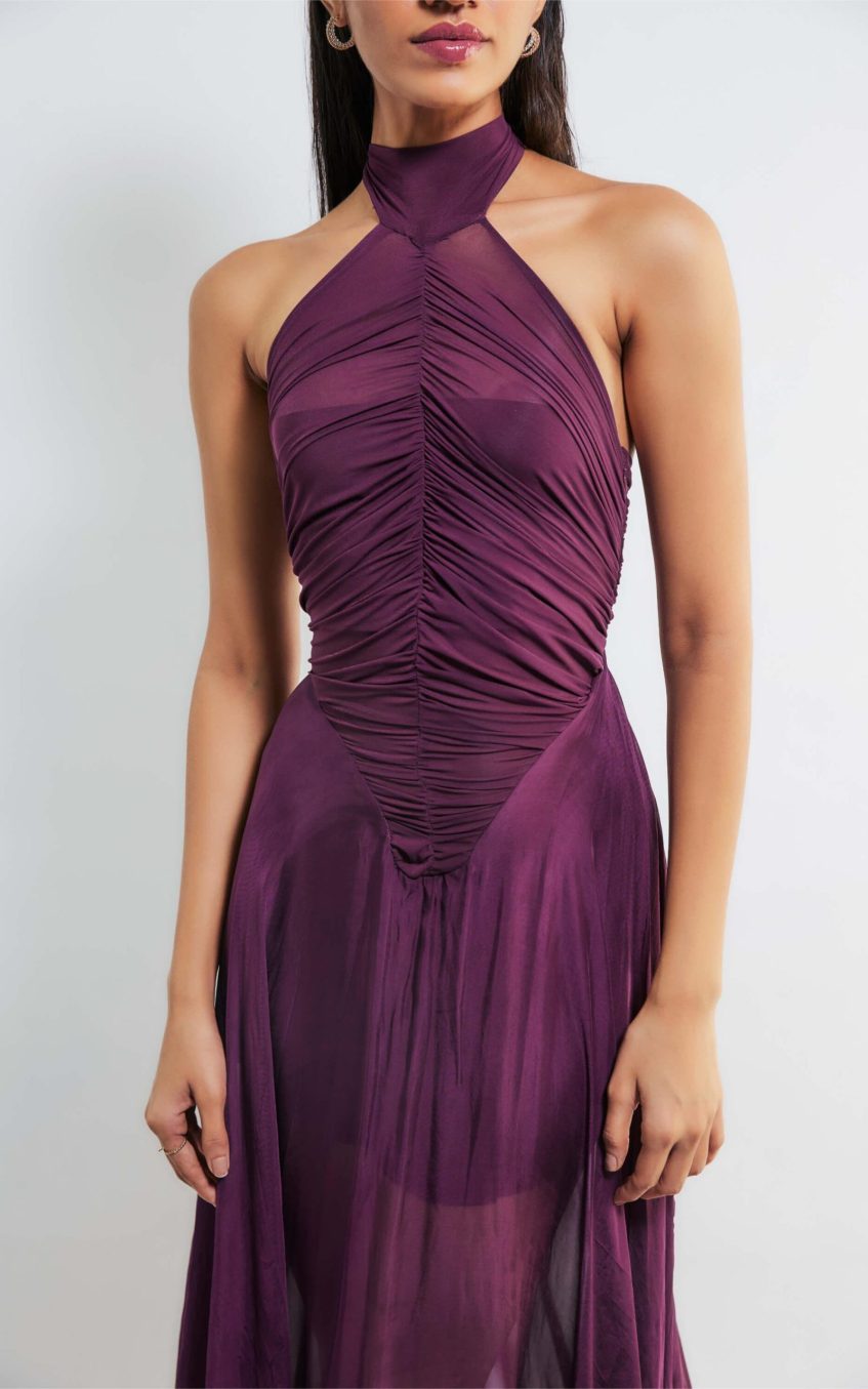 - Halter neck. ruched. sleeveless. solid color. purple
