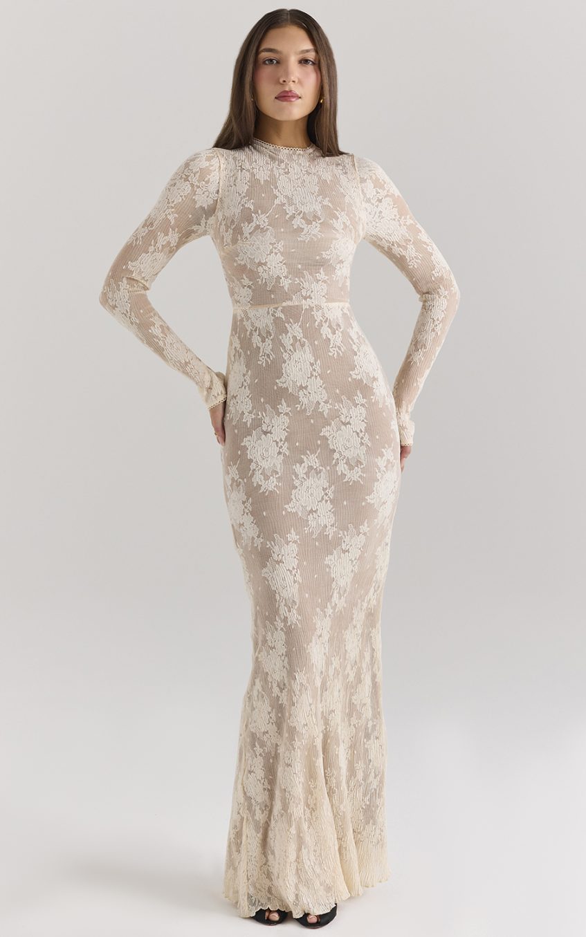 - Long sleeve. solid color. beige. lace. maxi dress