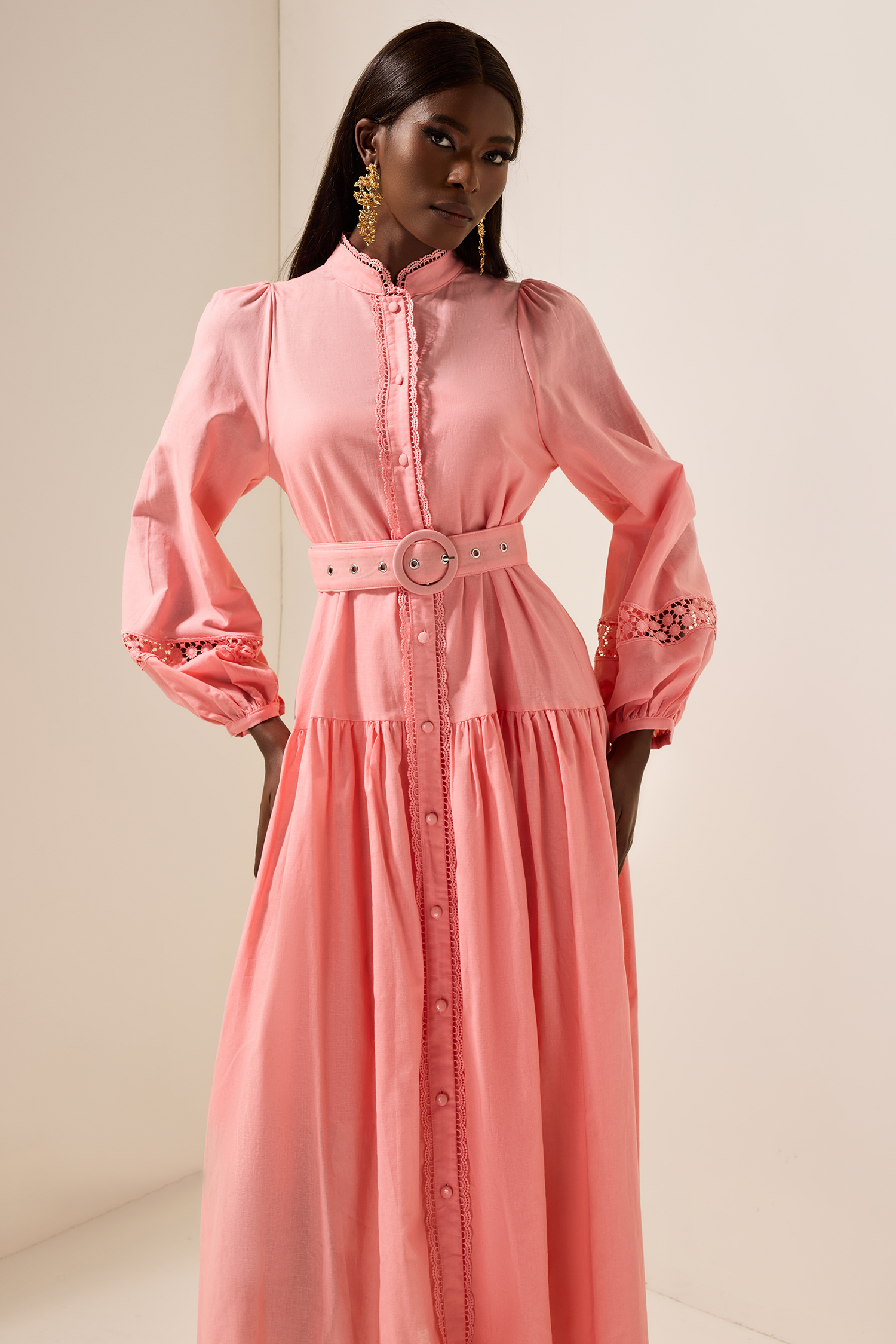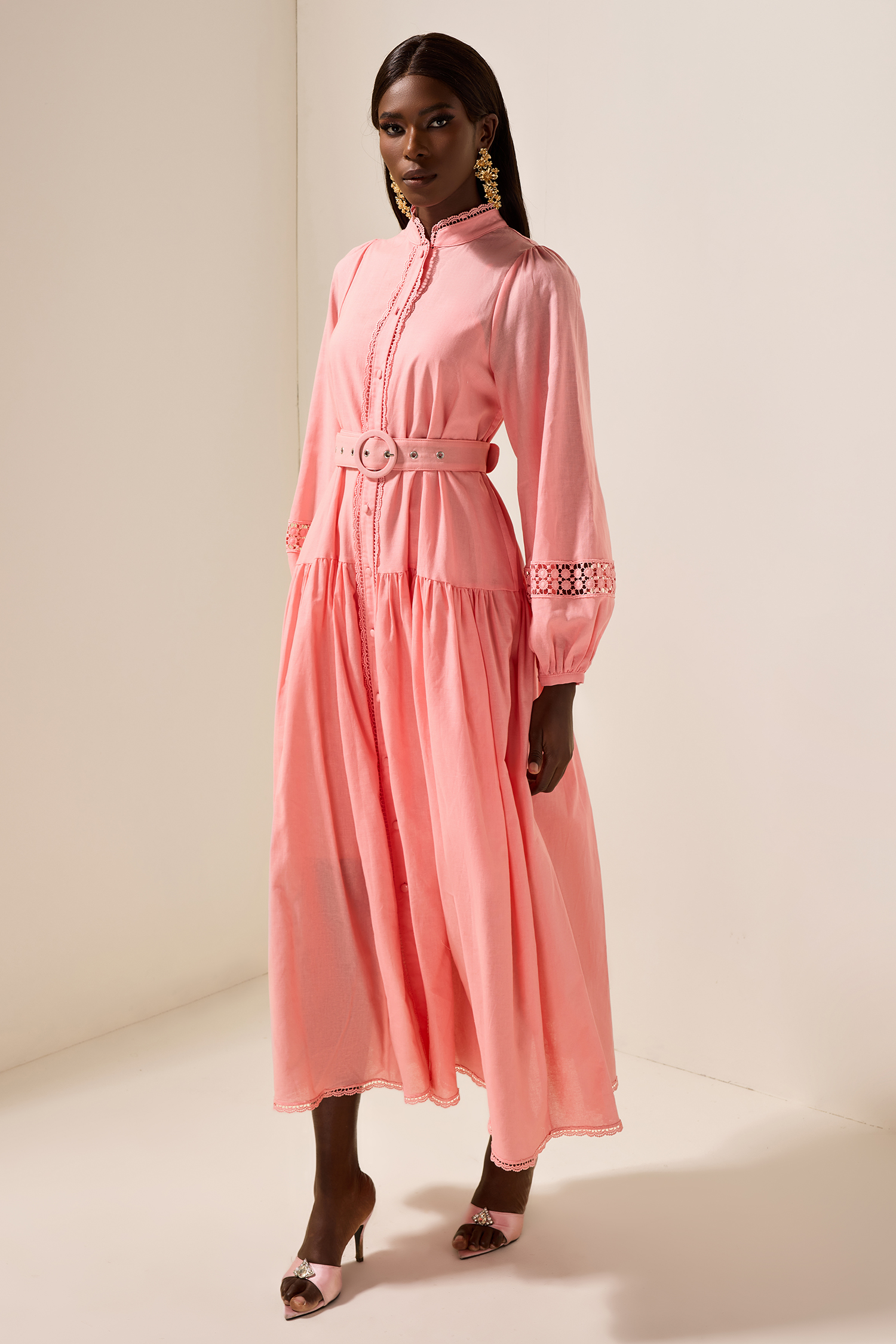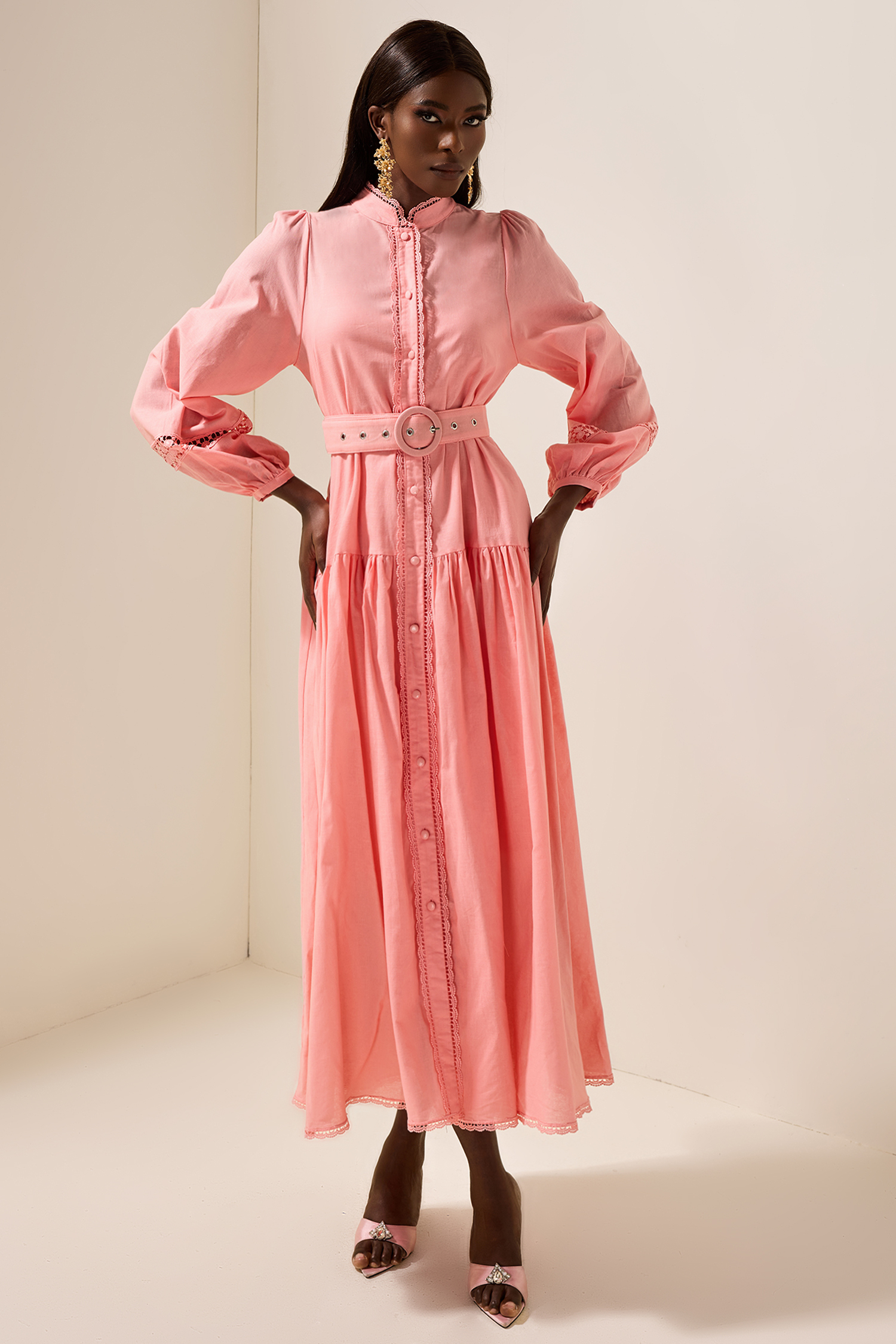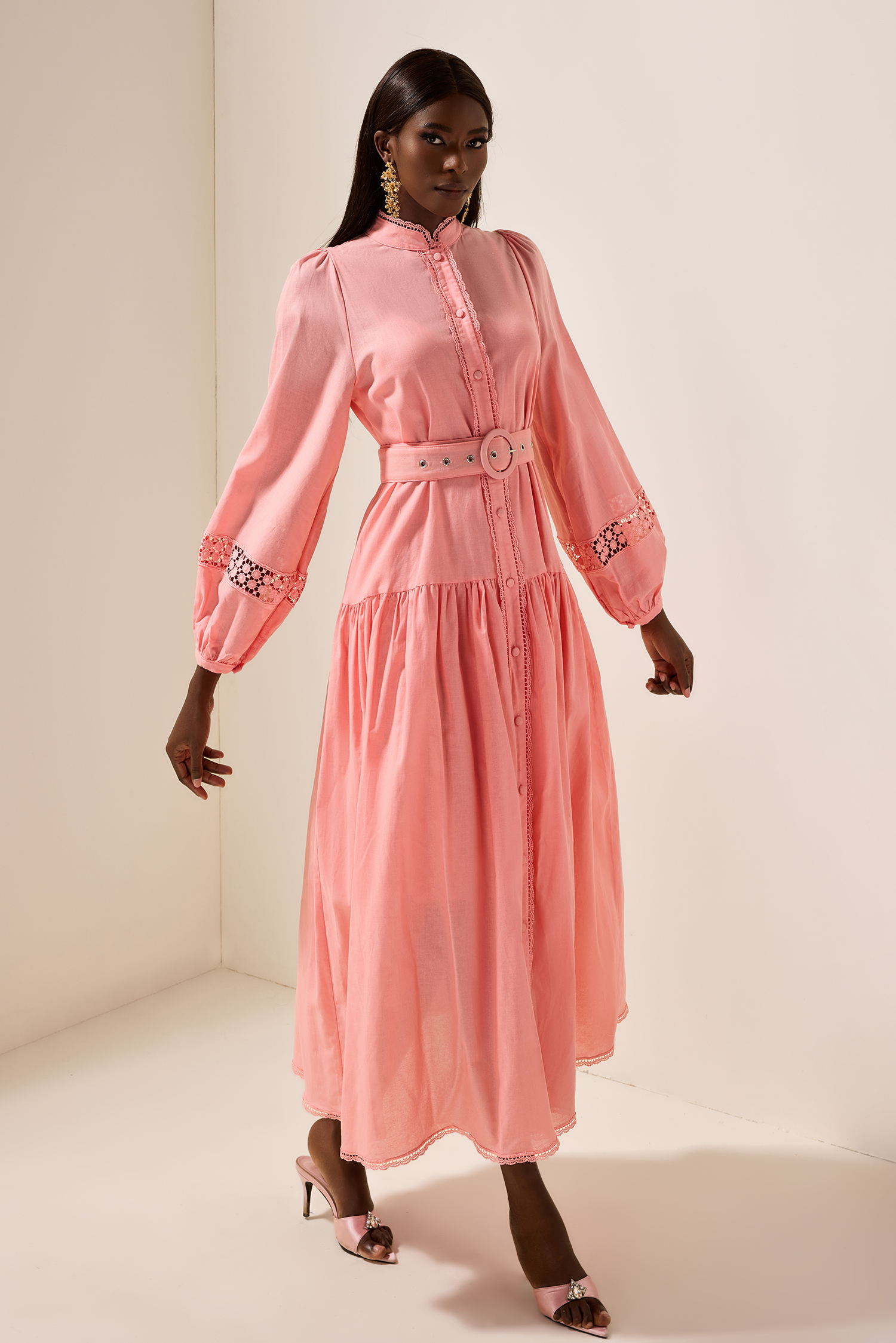 - Long sleeve. solid color. pink. lantern sleeve. with belt. midi dress