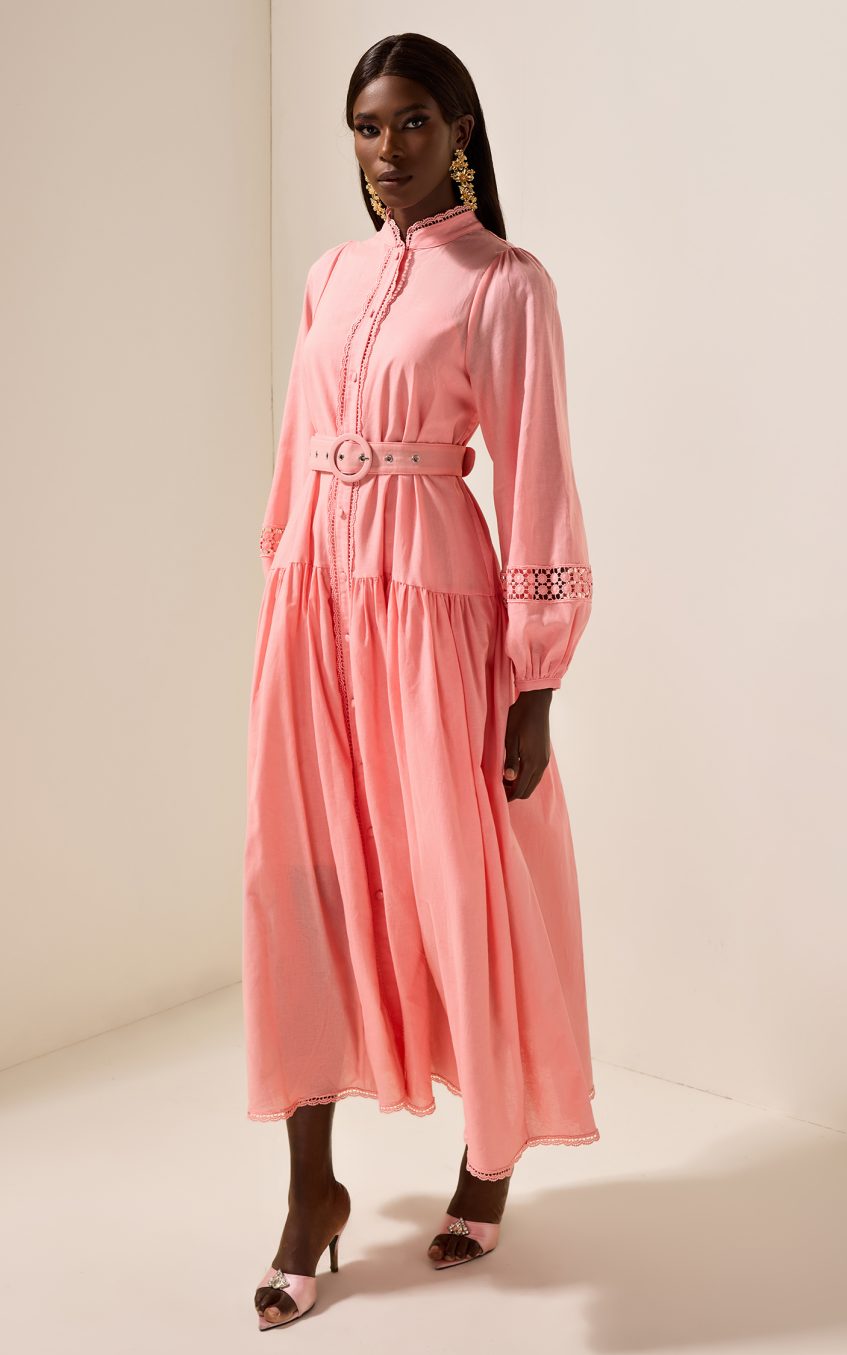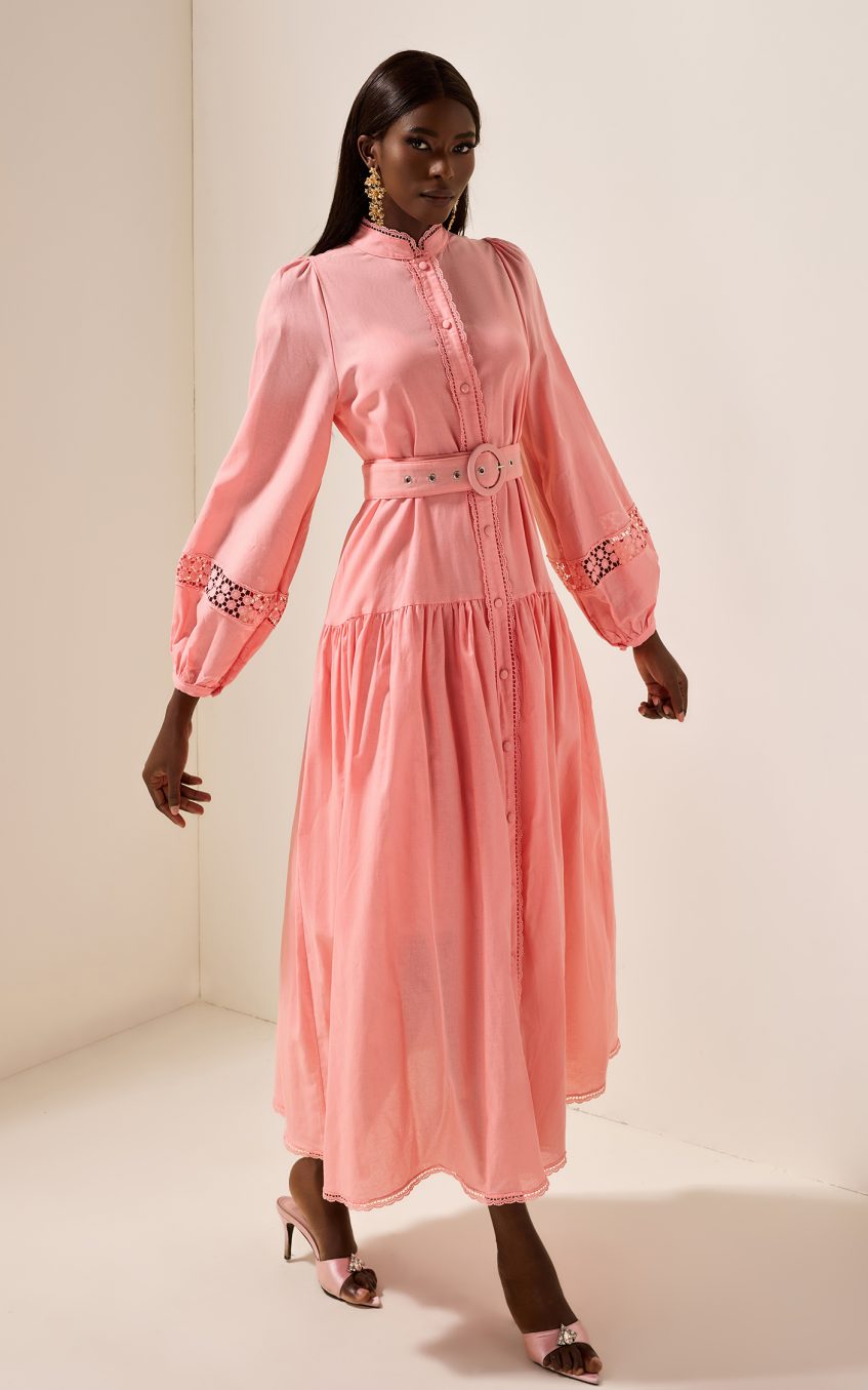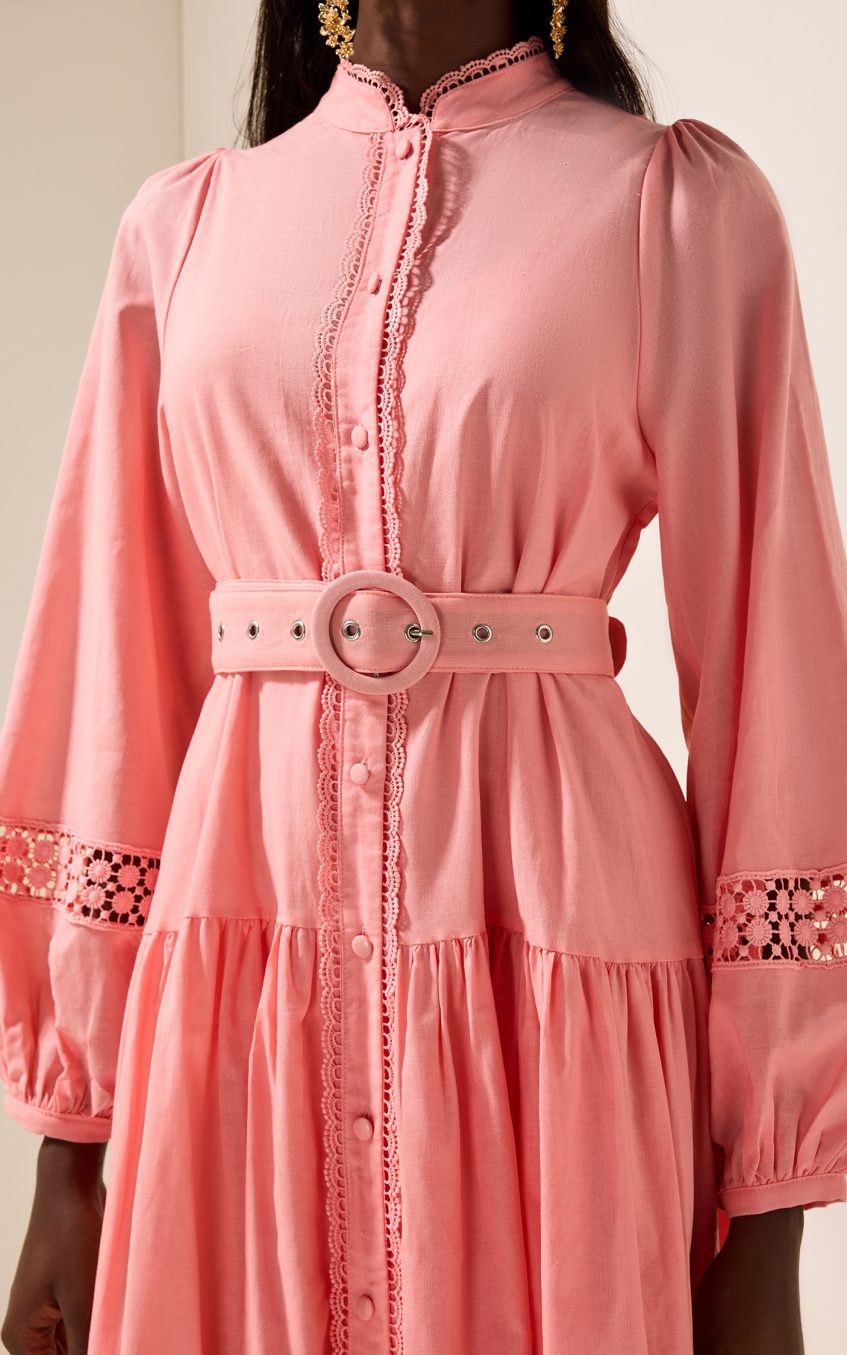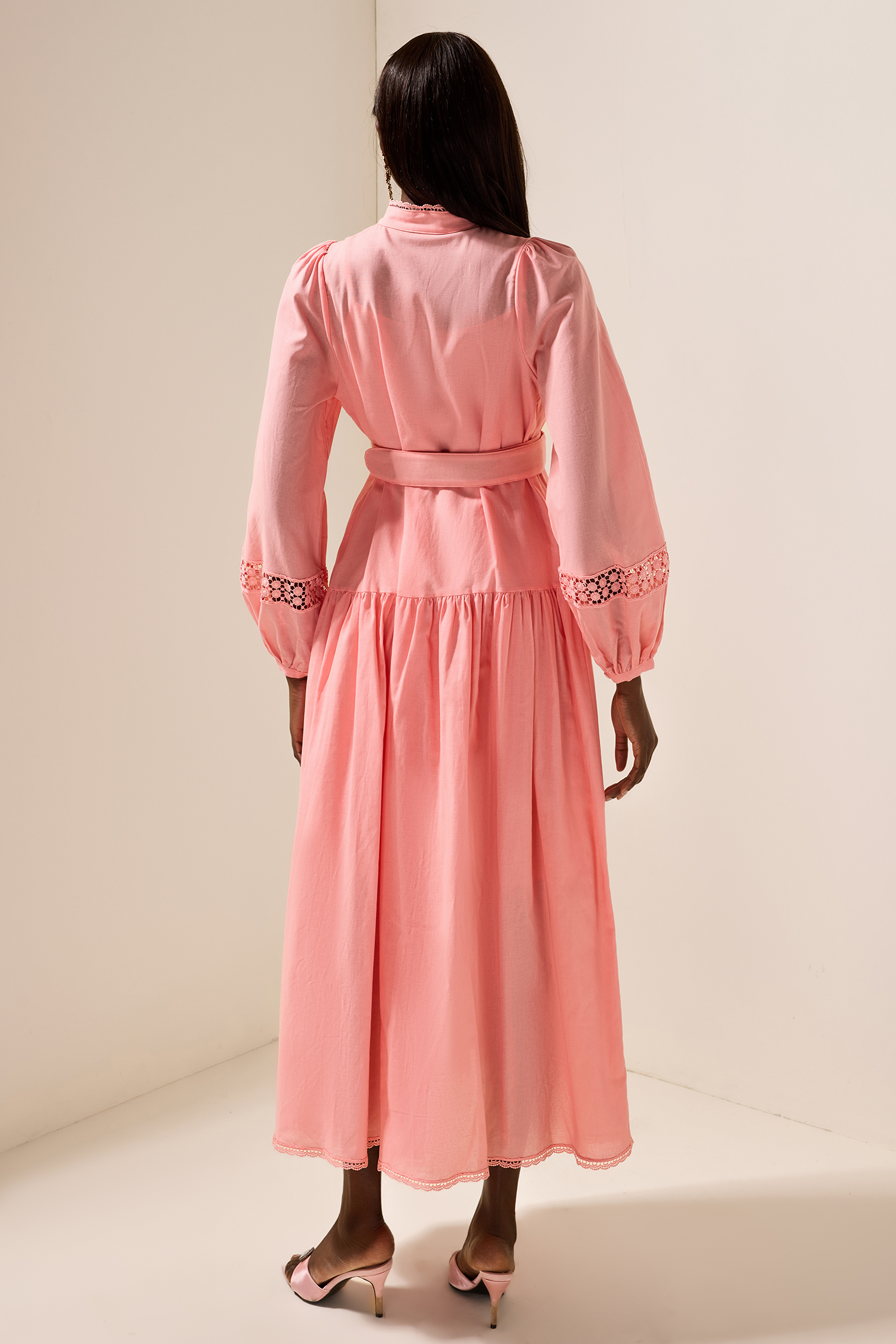 - Long sleeve. solid color. pink. lantern sleeve. with belt. midi dress