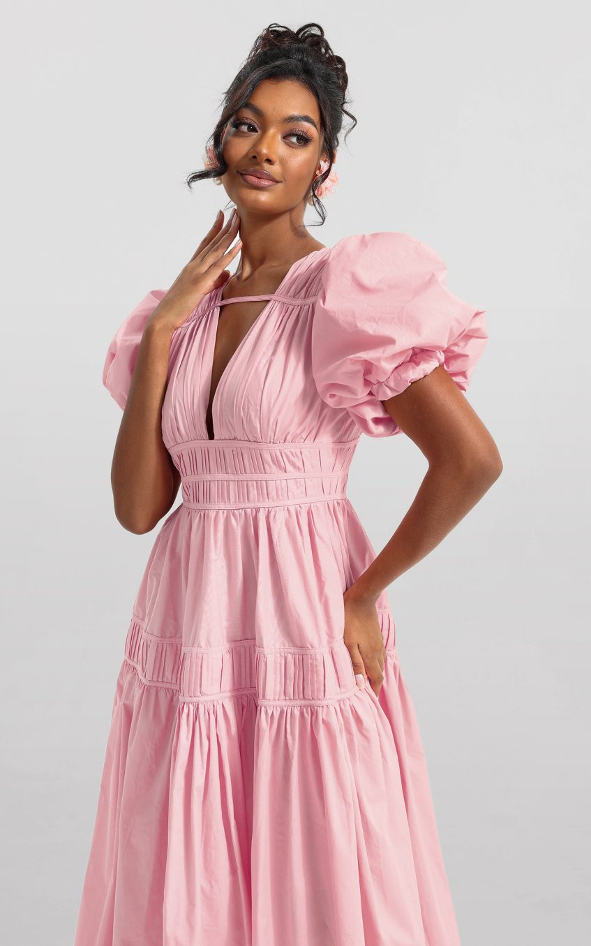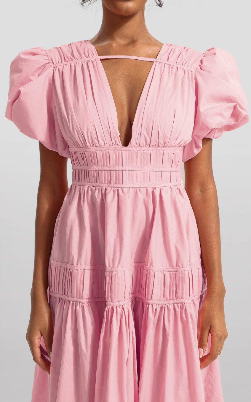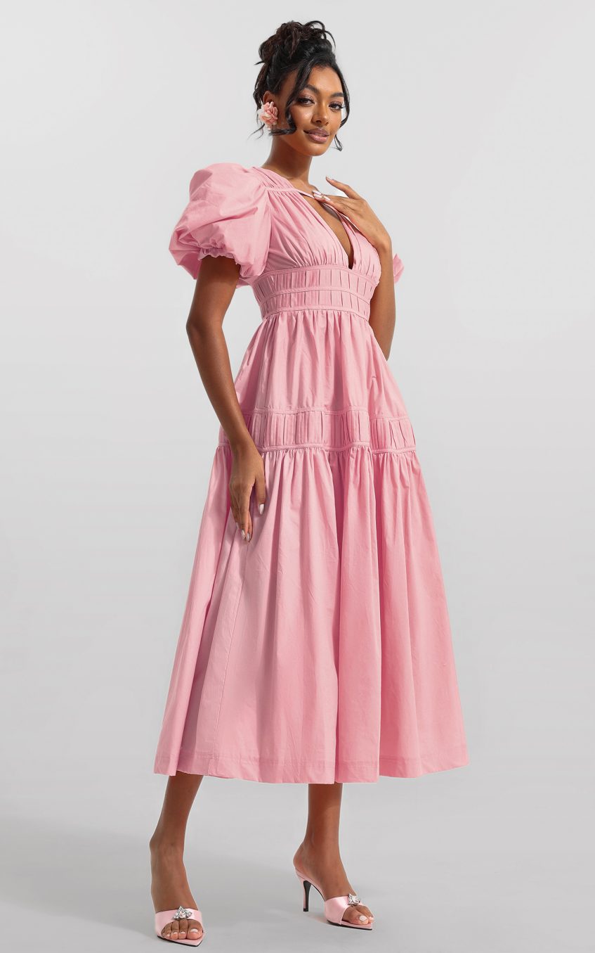 - Solid color. pink. v-neck. puff sleeve. short sleeve. midi dress
