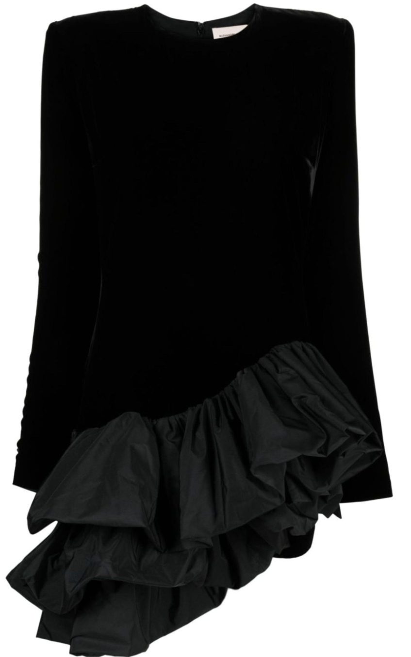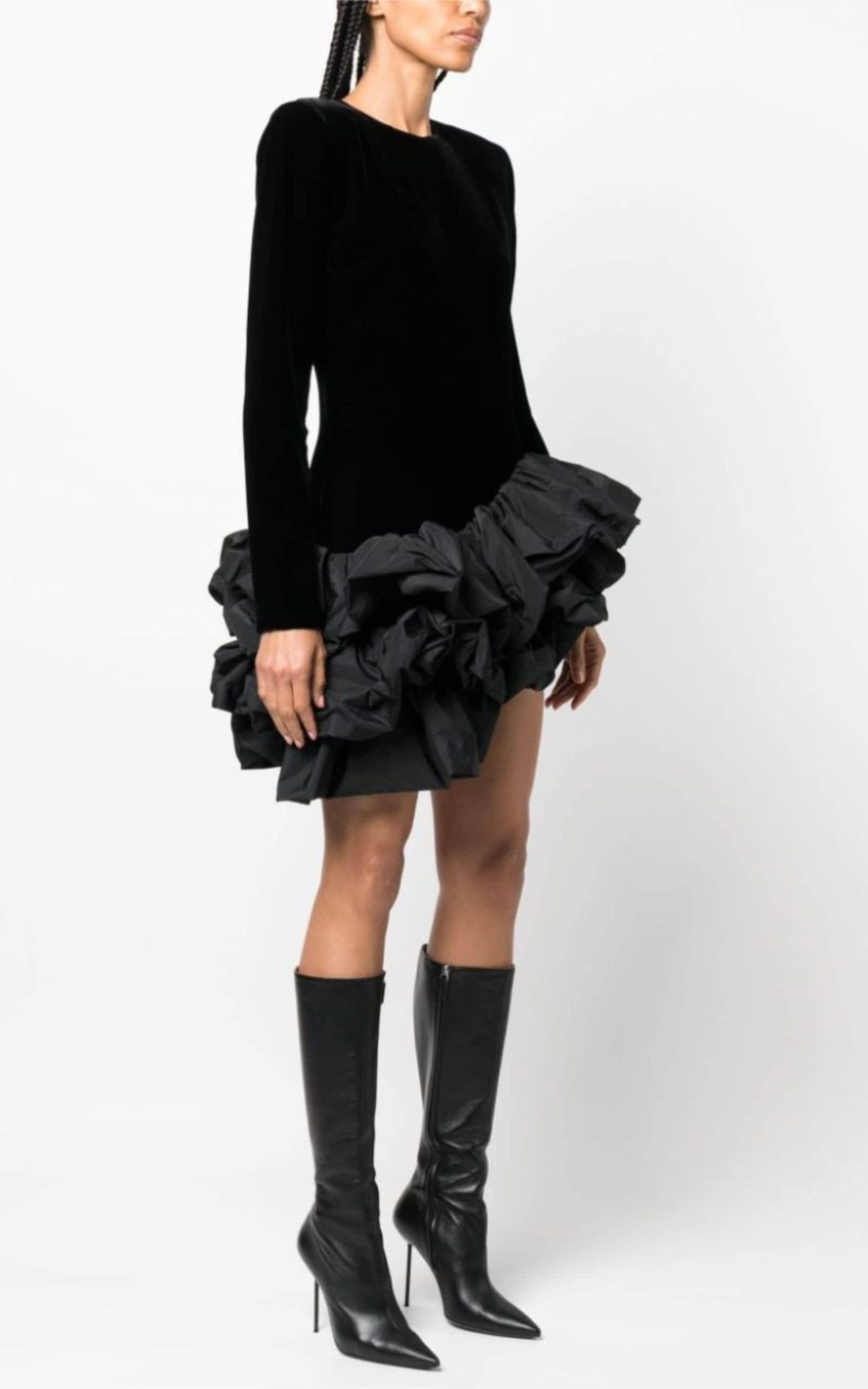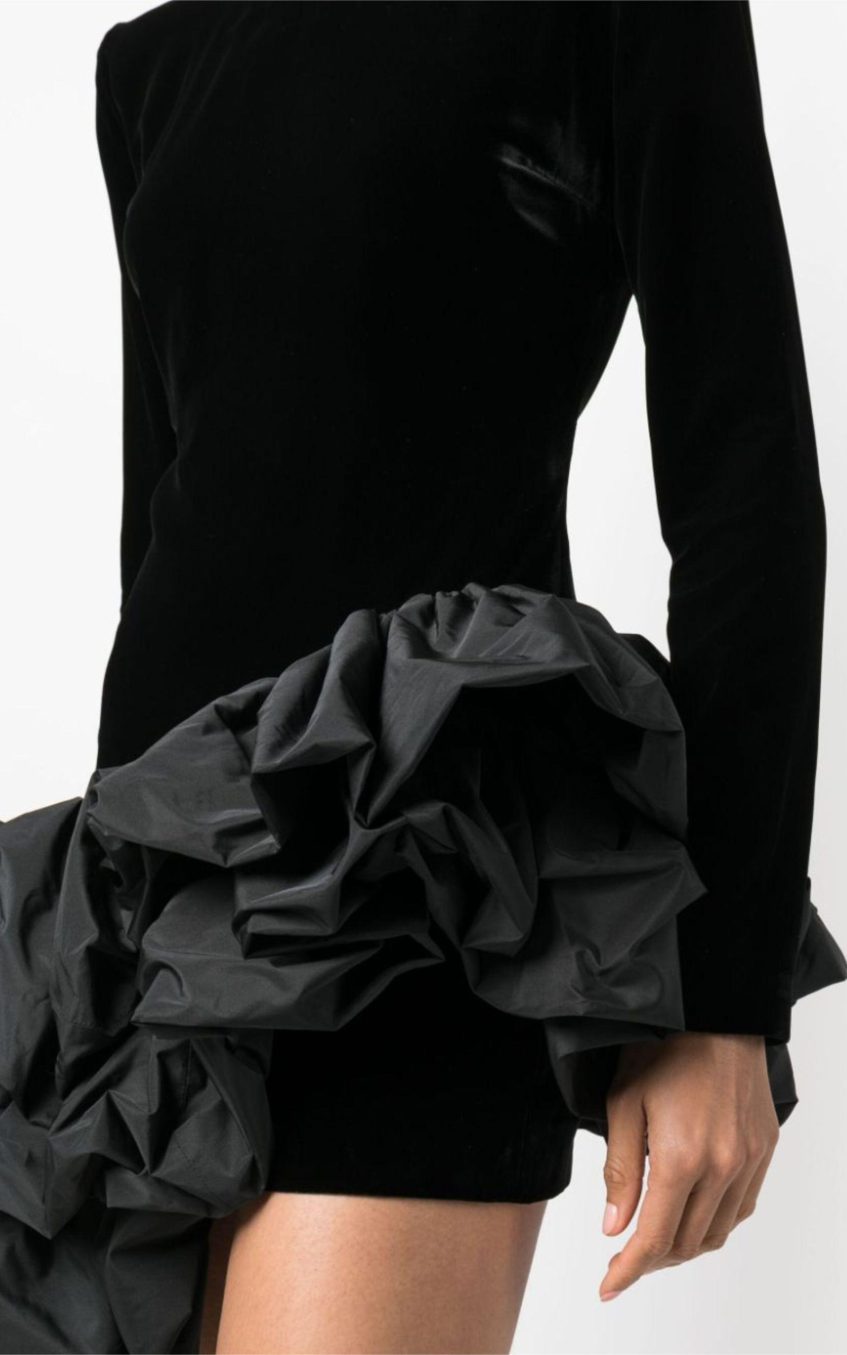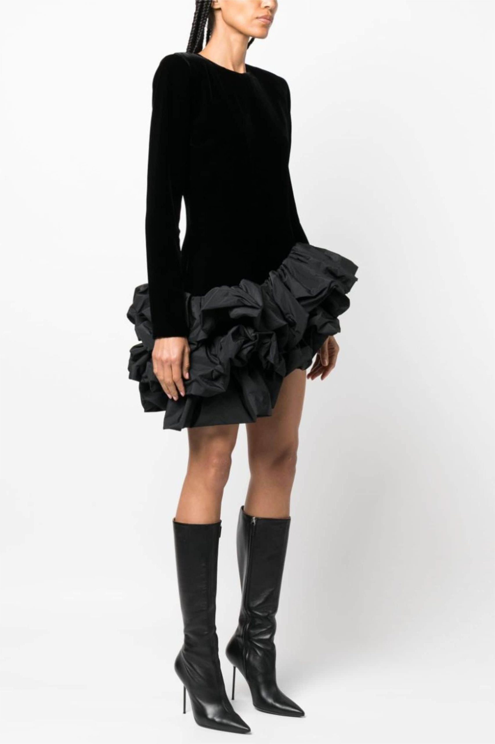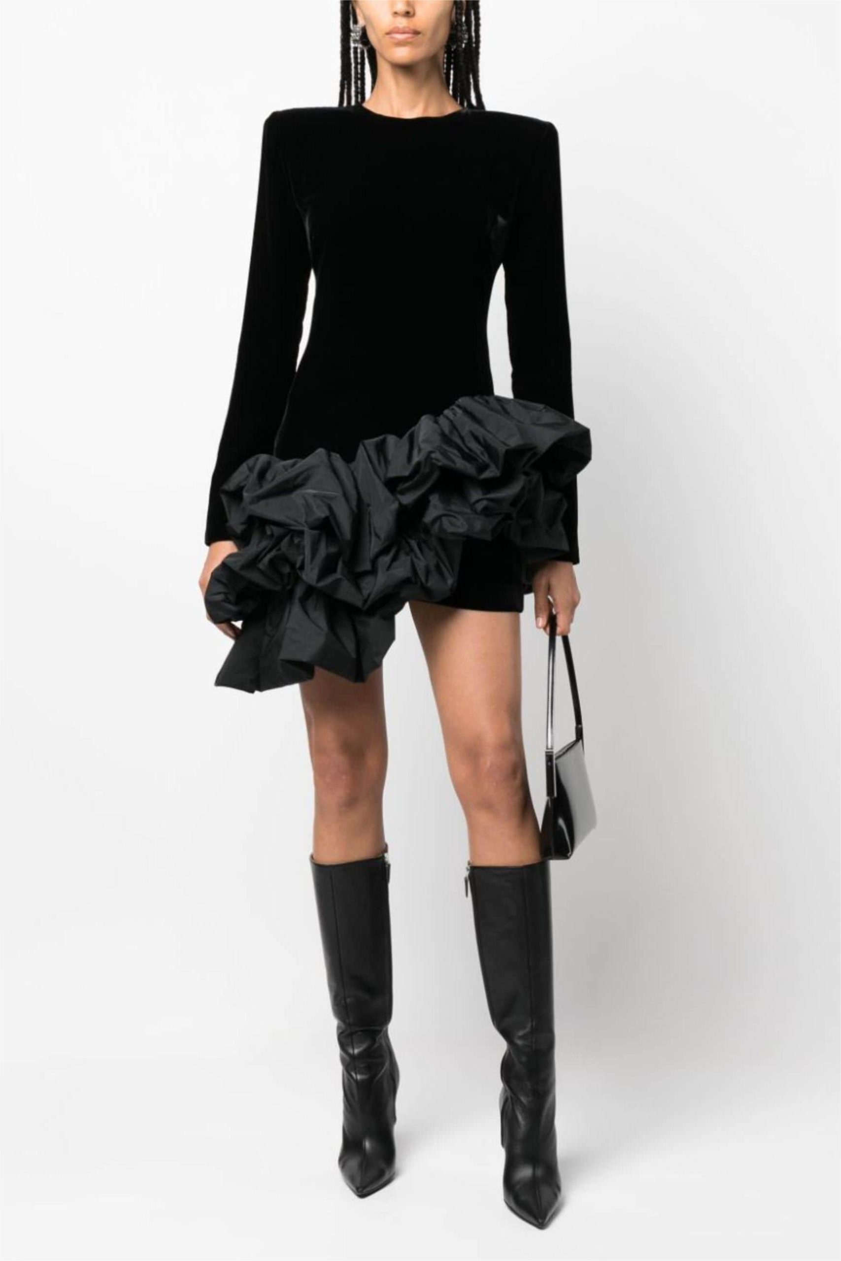- Solid color. black. velvet. long sleeve. ruffle. mini dress