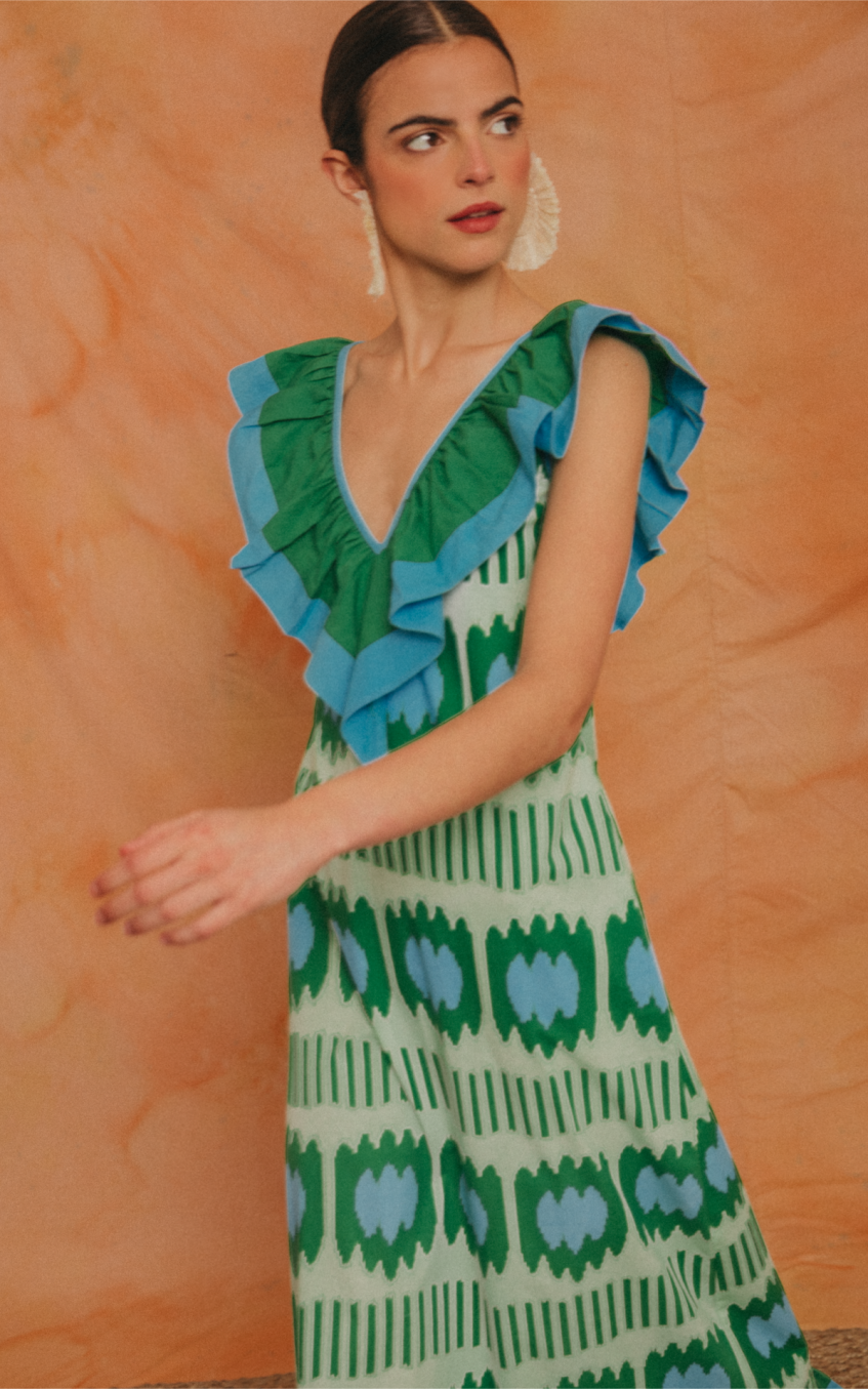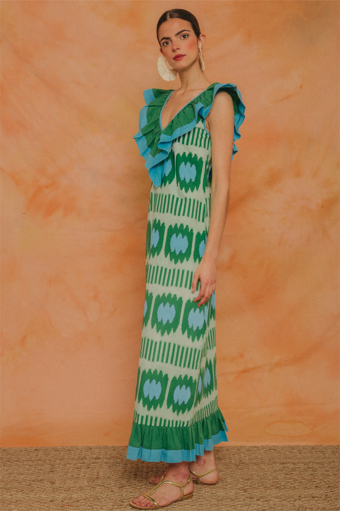 - Green. v-neck. ruffle. sleeveless. maxi dress